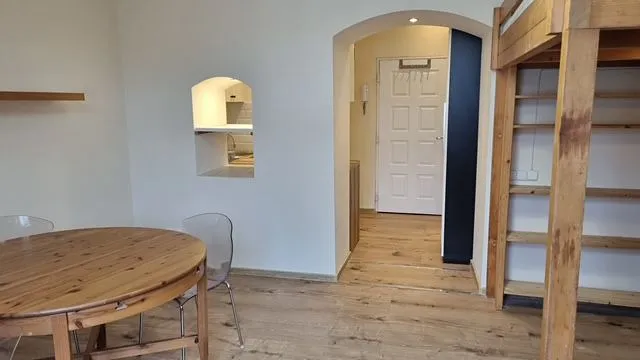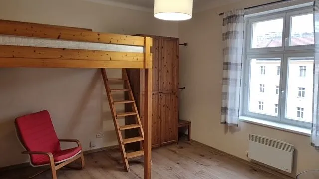 Majiteli byly zde použity velmi kvalitní materiály, které si zaslouží Vaši péči. Bytová jednotka poskytuje komfort a pohodlí, jak je to jen na 33 m2 možné. Dřevěné podlahy, velké okno do klidného vnitrobloku a výška stropů 3m vyzývá k inspiraci. Naleznete nejen vestavěné skříně, úložný prostor nad kuchyňskou linkou, ale také vysokou postel, která tvoří současně podhledový obytný prostor, jehož výška je 1,83 m