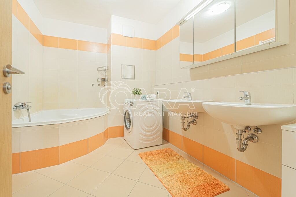 K bytu náleží nadstandardně velké parkovací místo (1,5 násobně širší) v podzemní garáži, které zajišťuje pohodlné parkování i pro velký vůz a přímo u něj je sklep 8,1 m².