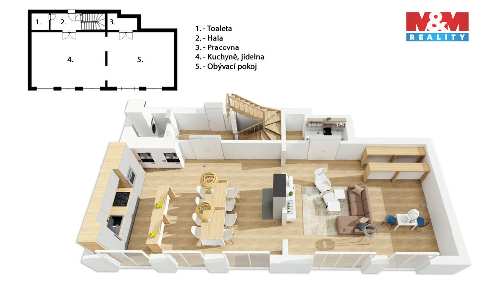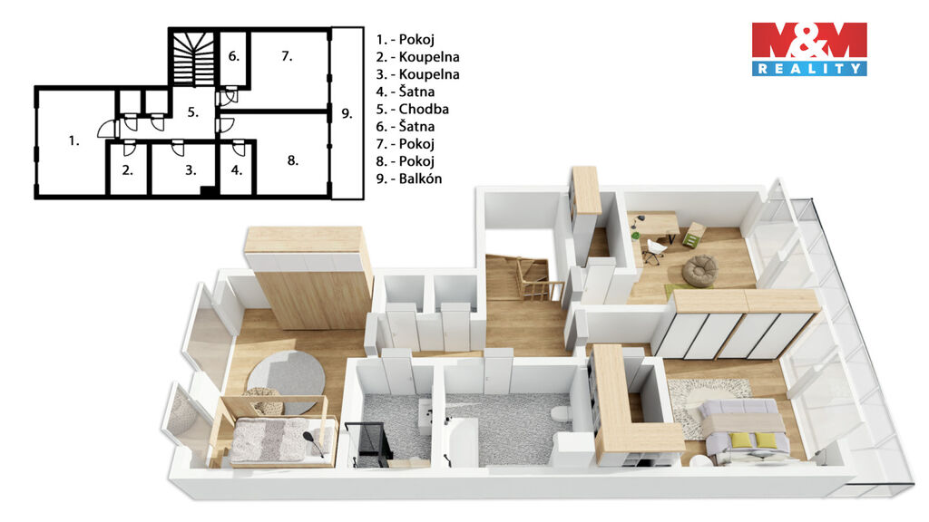V přízemí se nachází prostorný obývací pokoj s nadstandardně vybavenou kuchyňskou linkou, jídelnou a vstupem na velkou terasu. Dále bar s vinotékou, pracovna, krb, toaleta, úložný prostor a vstupní chodba. V patře jsou tři ložnice, z nichž dva s vestavěnou šatnou. Dvě menší šatny jsou poté na chodbě. K dispozici jsou dvě koupelny s toaletou a balkon o velikosti 14 m², přístupný ze dvou ložnic. K bytu náleží dvě parkovací místa v garáži. Obyvatelé mohou využívat společnou zahradu s posezením a sdílenou saunu. Dům se nachází v oblíbené lokalitě Praha 6 – Břevnov s výbornou dopravní dostupností do centra, v blízkosti letiště i mezinárodních škol. Veškerá občanská vybavenost je v dosahu.