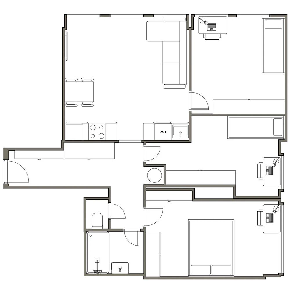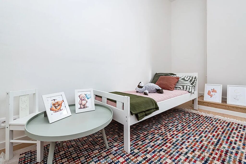 Dispozice bytu nabízí obývací pokoj s kuchyňským koutem a tři samostatné pokoje – ideální jako ložnice, dětské pokoje či pracovna. Koupelna je vybavena sprchovým koutem, toaleta je oddělená. Vstupní chodba poskytuje dostatek místa pro úložné prostory. K bytu náleží sklepní kóje o velikosti 3 m², v domě je dále k dispozici kolárna/kočárkárna v přízemí.