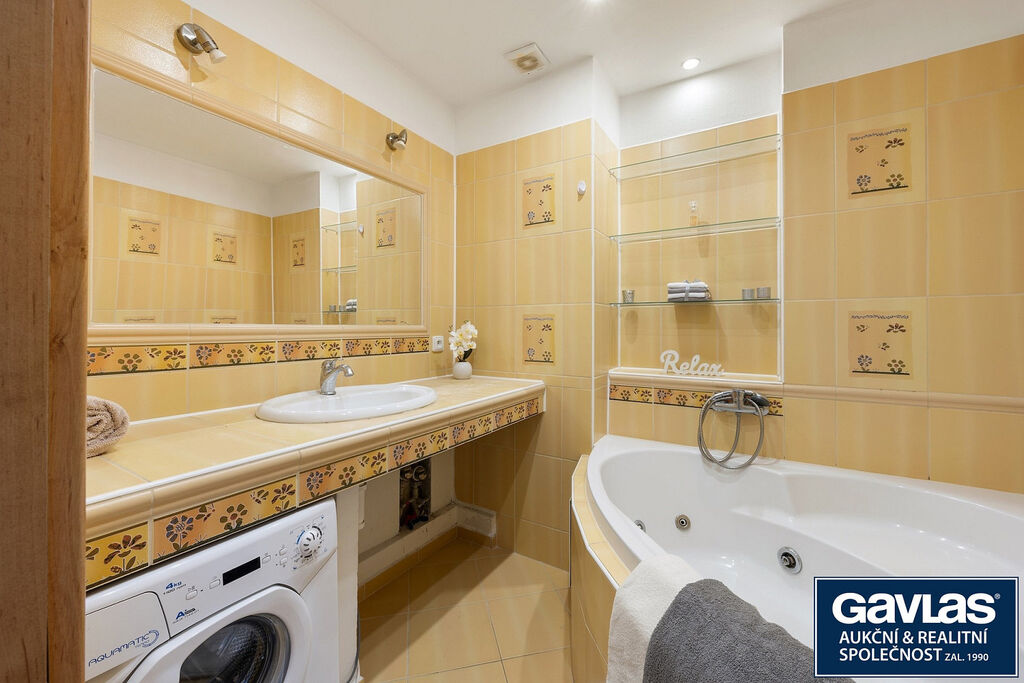 • Koupelna s rohovou vanou, umyvadlem, dostatkem úložného prostoru a pračkou.