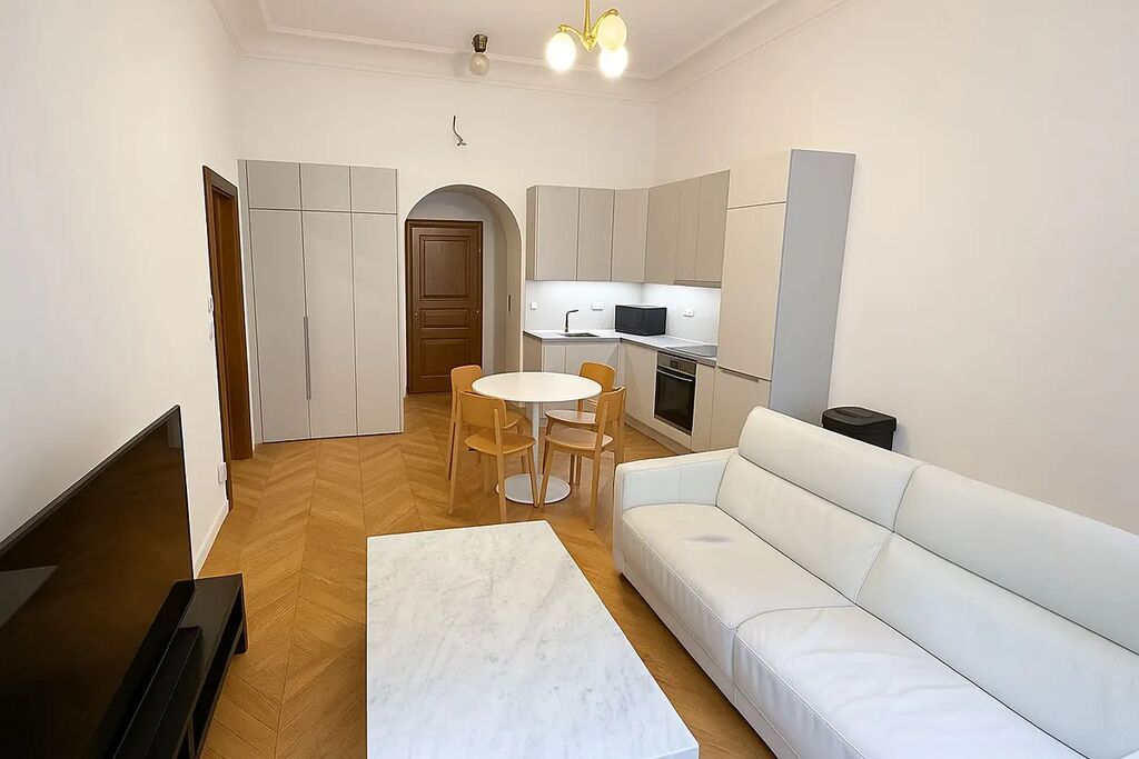 Byt je zařízený a nabízí plně vybavenou kuchyňskou linku, stylový mramorový konferenční stolek, pohovku, dvě pohodlná křesla, jídelní stůl se čtyřmi židlemi, prostorný pracovní stůl a postel.