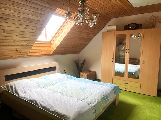 V přízemí se nachází 2+kk – předsíň, kuchyň, jídelna, obývací pokoj s krbem, ložnice, koupelna a WC.
