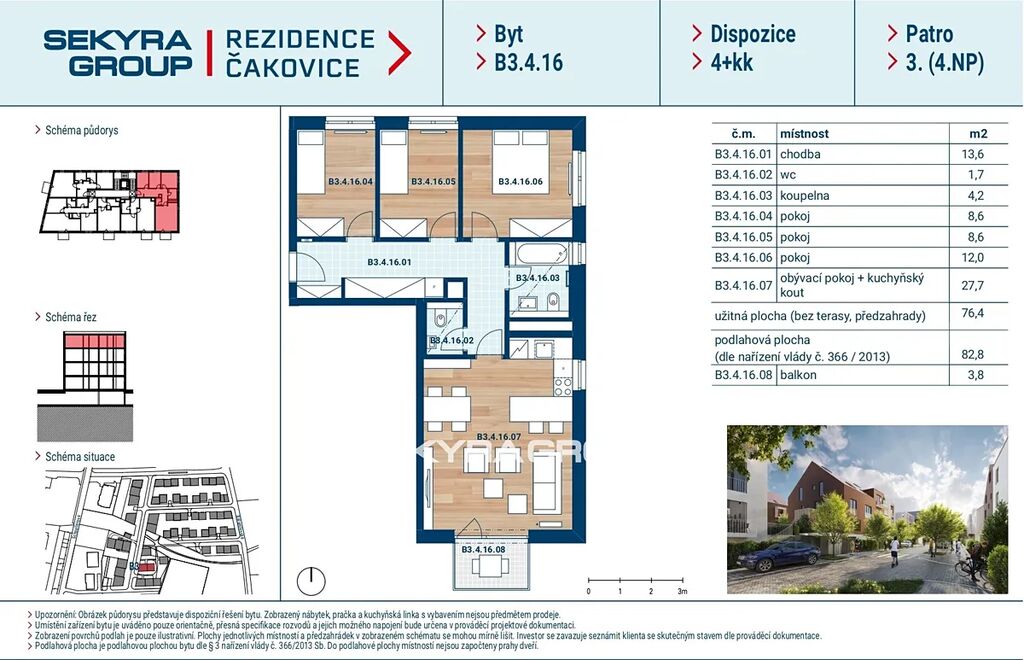 Dovolujeme si Vám nabídnout k prodeji byt 4+kk o výměře 82,7 m² s balkónem 3,8 m² v rezidenčním projektu Rezidence Čakovice, etapa B.
