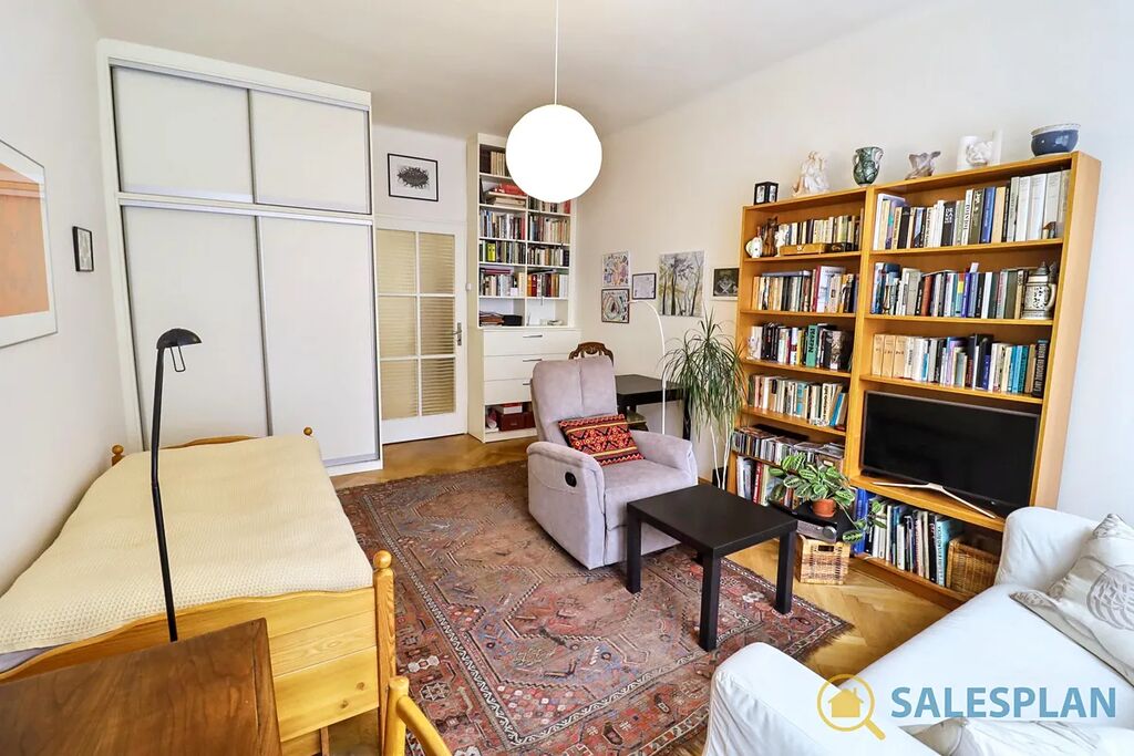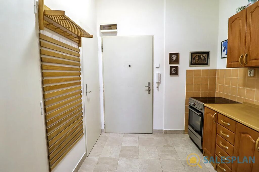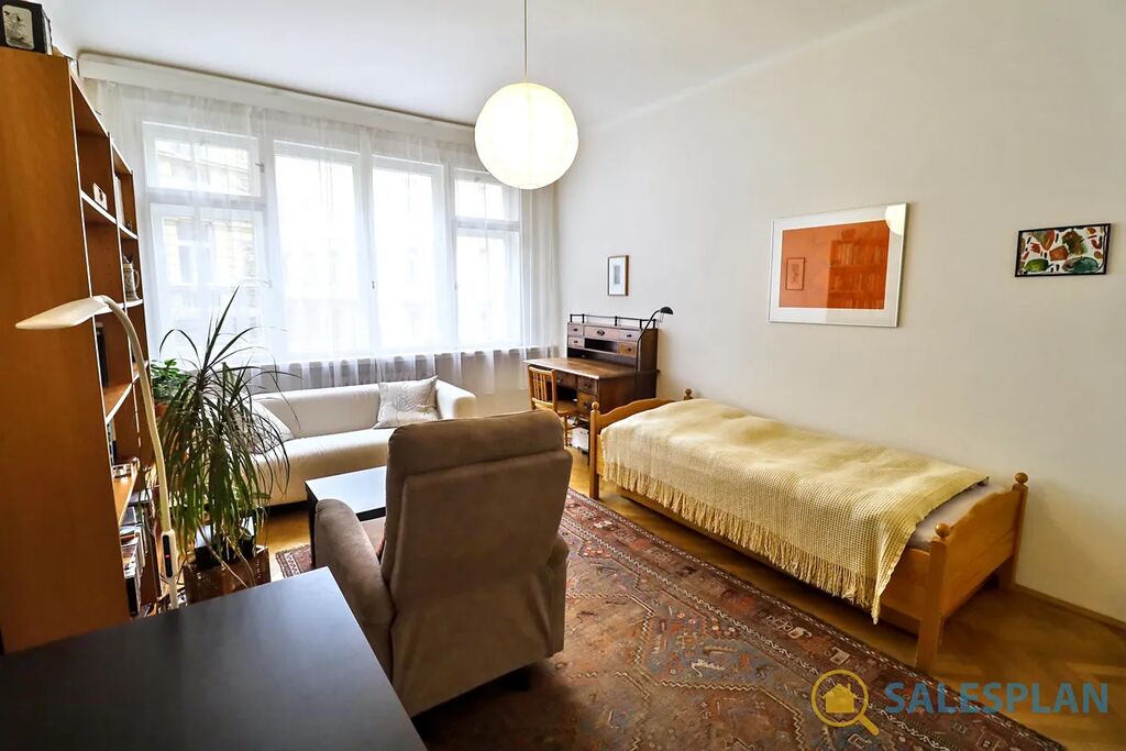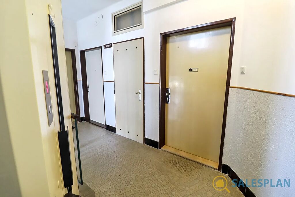 Bytová jednotka v osobním vlastnictví se nachází ve třetím nadzemním podlaží cihlového domu s výtahem. Je ve velmi dobrém a průběžně udržovaném stavu, včetně krásných parket, které jsou zajímavým designovým prvkem celého bytu. Centrální vstupní chodba, vzhledem ke svým rozměrům, poskytla prostor pro efektivní umístění kuchyňské linky. Díky vysokým stropům a renovovaným kastlovým oknům, které jsou téměř přes celou šířku hlavní místnosti, působí jednotka vzdušným a příjemným dojmem. Skvělá jižní orientace zajišťuje prosvětlení interiéru téměř po celý den. K dispozici jsou interiérové rolety. Koupelna a toaleta jsou řešeny samostatně.