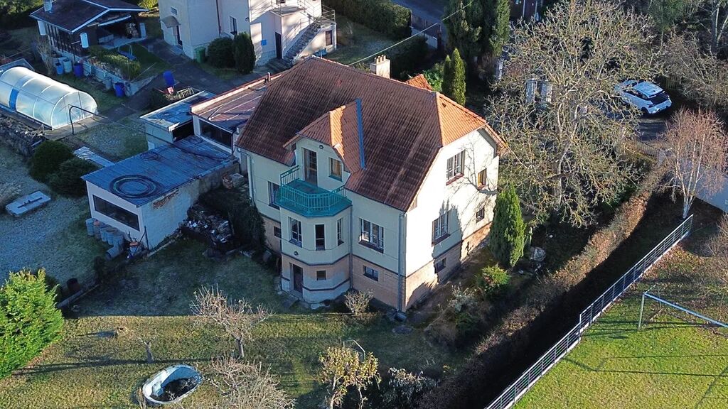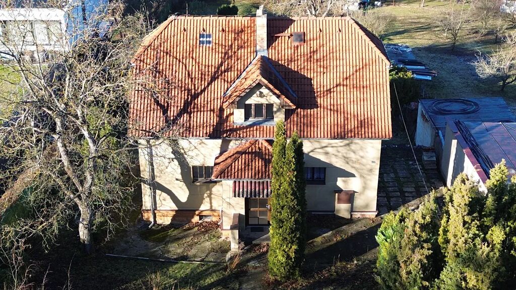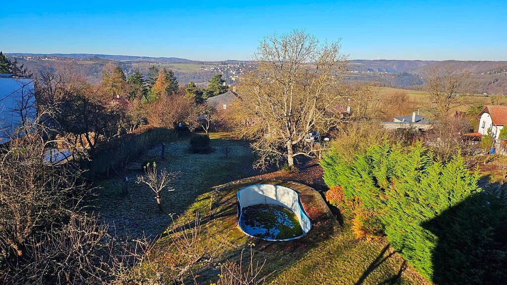 Vlastní pozemek 1.805 m2, zastavěná plocha domu 93 m2, oploceno, mírně svažitý pozemek se SZ orientací, udržovaná okrasná zahrada. Parkování vozidla bezproblémové v přilehlé ulici či na vlastním pozemku. Velice pěkný výhled do krajiny včetně údolí Vltavy.