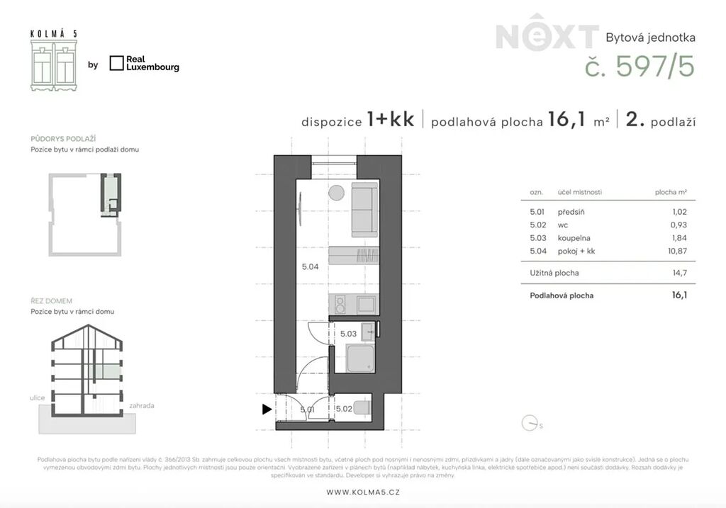 Tato konkrétní jednotka č.5 o dispozici 1kk a podlahové ploše 16,1 m2 se nachází ve 2 nadzemním podlaží s výhledem do zahrady. Je členěna na vstupní chodbu, oddělenou koupelnu, samostatnou toaletu a obývací pokoj s kuchyňským koutem. Přesné rozložení si můžete prohlédnout na přiloženém půdorysu. Vytápění je řešeno elektrickými přímotopy a ohřev vody elektrickým bojlerem.