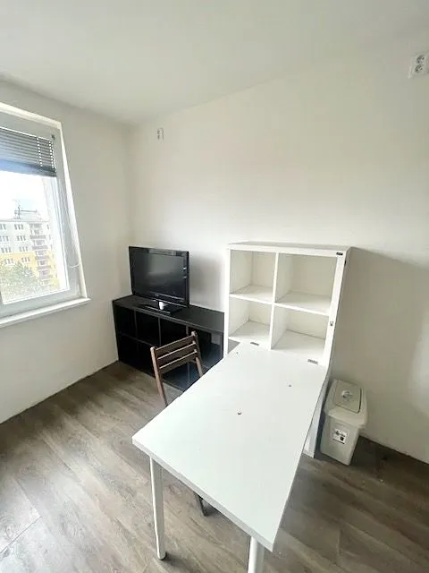 Vstupem do bytu se ocitnete v předsíni o ploše 2,15 m2 s vestavěnou skříní. Hned po pravé straně od vstupu do bytu se nachází prostorná koupelna o ploše 2,7 m2 se sprchový koutem, toaletou, umývadlem a prostorem na pračku. Naproti vstupu do bytu je umístěn obývací pokoj s kuchyňským koutem o ploše 14,5 m2, patrovou postelí, rozkládací postelí, policovou skřínkou, pračkou, lednici, televizi a pracovním koutem. Na podlaze předsíně a obývacího pokoje s kuchyňským koutem je položena vinylová podlaha, na podlaze koupelny s toaletou je keramická dlažba. Orientace bytu je na jihozápad, k bytu přináleží také sklep o ploše 2,13 m2 a k dispozici je rovněž využití balkonu v mezipatře.