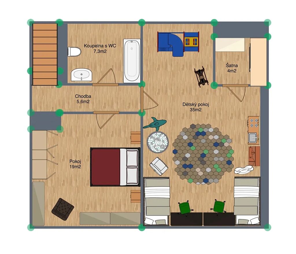 S užitnou plochou 182 m2 a podlahovou plochou 255 m2 je prostor v domě efektivně využitý. Dům je vybaven prostorným sklepem o velikosti 34 m2 a nabízí pohodlné parkování, včetně garáže. I když je plocha zahrady 37 m2, její výhodou je snadná údržba při současném bydlení na prestižní adrese v centru obce. Blízkost veškeré dopravní dostupnosti, jako je vlak, dálnice, silnice, MHD a autobus, zajišťuje rychlý a komfortní přístup k okolním službám a lokacím.