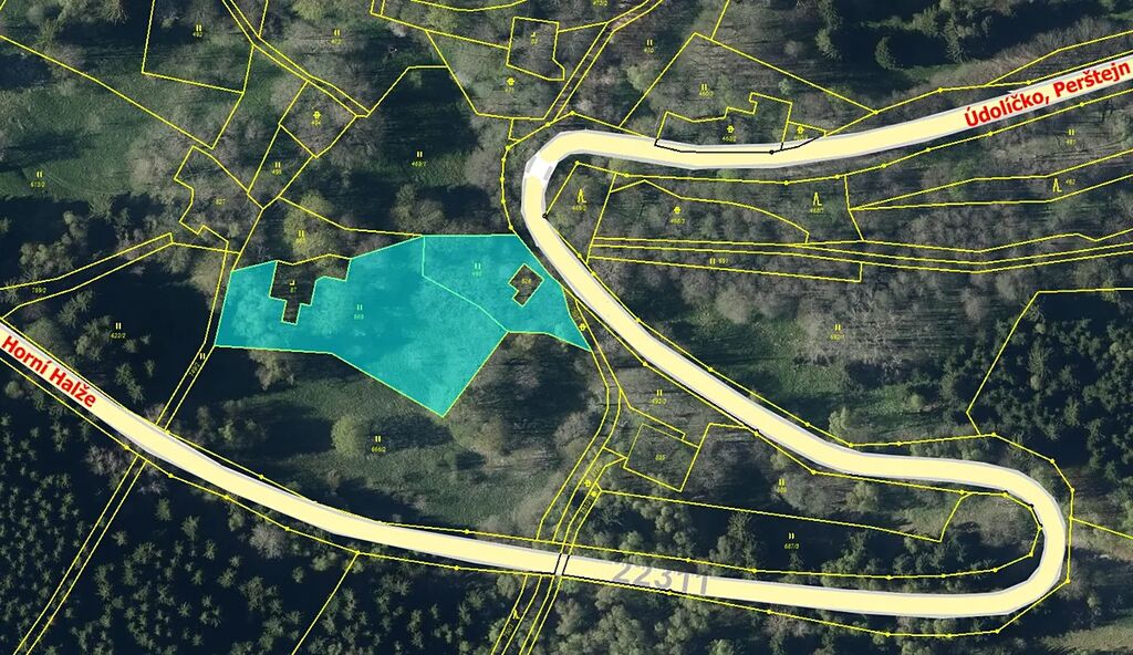 Pozemky jsou přístupné ze silnice Perštejn, Údolíčko - Horní Halže. Na pozemku jsou vzrostlé stromy. V těsné blízkosti potoka. V územní plánu vedené jako trvalý travní porost.