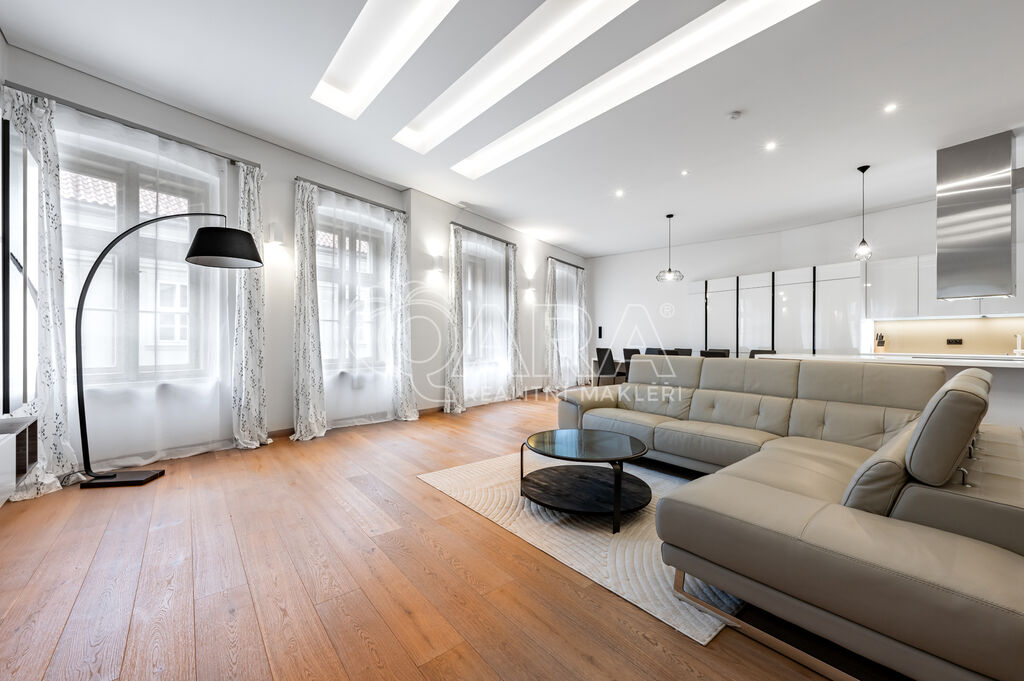 Pronájem designového, špičkově vybaveného luxusního bytu, 3kk, 186m2 v 1. patře nákladně rekonstruované residence. Lokalita v srdci metropole je perfektně dostupná MHD, autem i na kole a nabízí překvapivě klidné a příjemné městské bydlení se všemi službami v bezprostřední blízkosti.