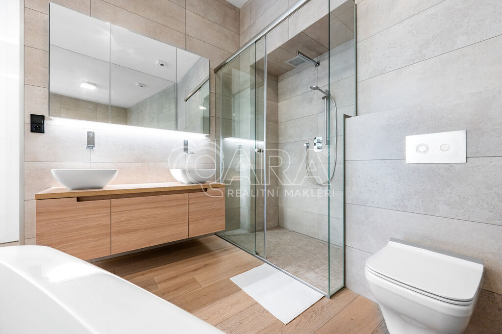 Bytu dominuje otevřený prostor obývacího pokoje s kuchyní, dvě prostorné ložnice, jedna ložnice s vlastní koupelnou s vanou a sprchovým koutem, druhá koupelna opět s vanou a sprchovým koutem.