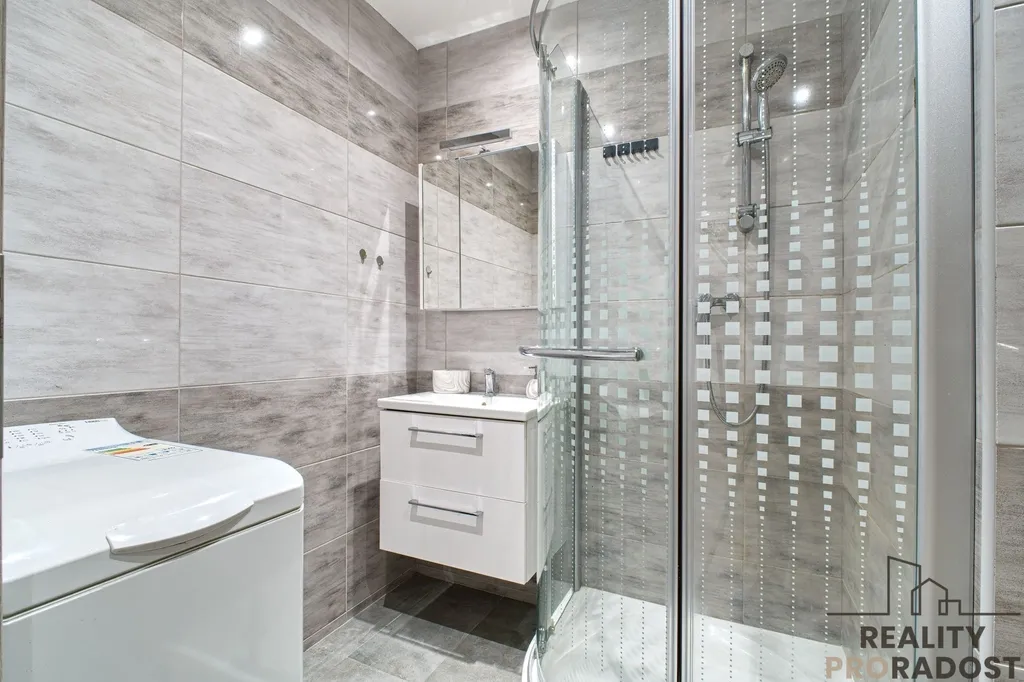 • Koupelna s WC po kompletní rekonstrukci – sprchový kout, umyvadlo se zrcadlem, moderní keramické obklady v přírodních tónech.