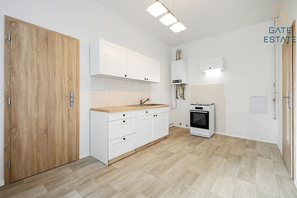 Dispozice je praktická a vzdušná: dva velké průchozí pokoje (z jednoho se vstupuje do druhého) doplňuje malý pokoj ideální jako pracovna nebo šatna. Samostatná kuchyně s novou linkou poskytne dostatek místa na vaření, disponuje plynovým sporákem a troubou. Koupelna má sprchový kout a WC je oddělené. K tomu potěší prostorná vstupní předsíně.
