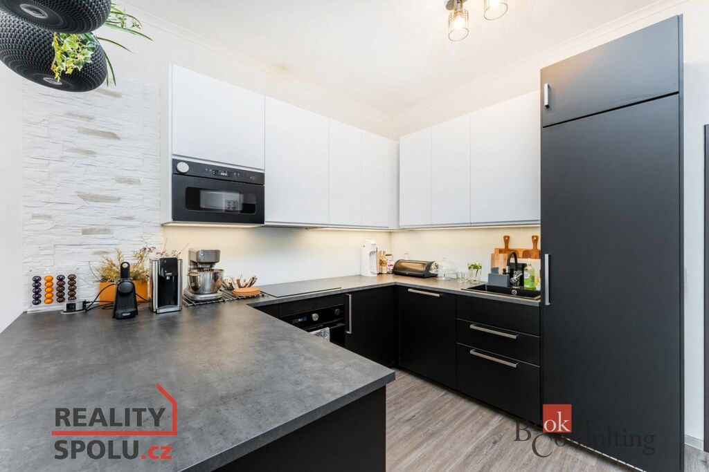 - Kuchyň značky IKEA s vestavěnými spotřebiči Siemens a Electrolux s jídelním koutem a propojená s obývacím pokojem