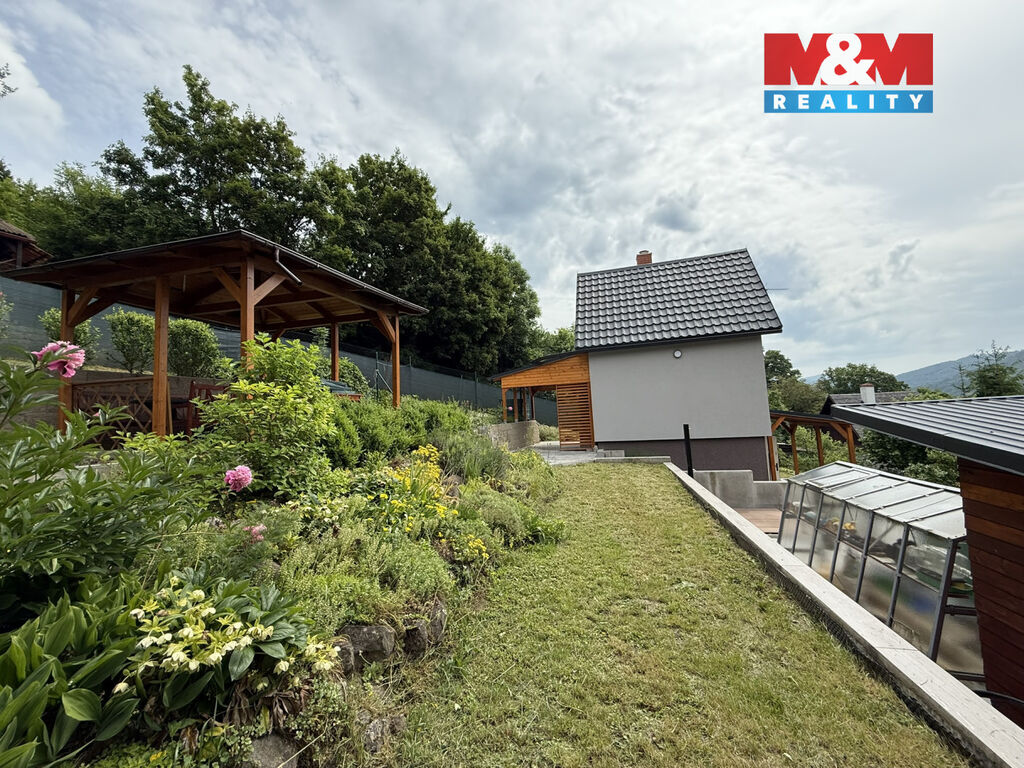 Na udržovaném pozemku (692 m²) najdete zahradu s ovocnými stromy, skleník, kůlnu i dřevník. Nechybí solární sprcha a naprosté soukromí. Topení zajišťují kamna a přímotopy, voda je sezónní s možností připojení na obecní řad.