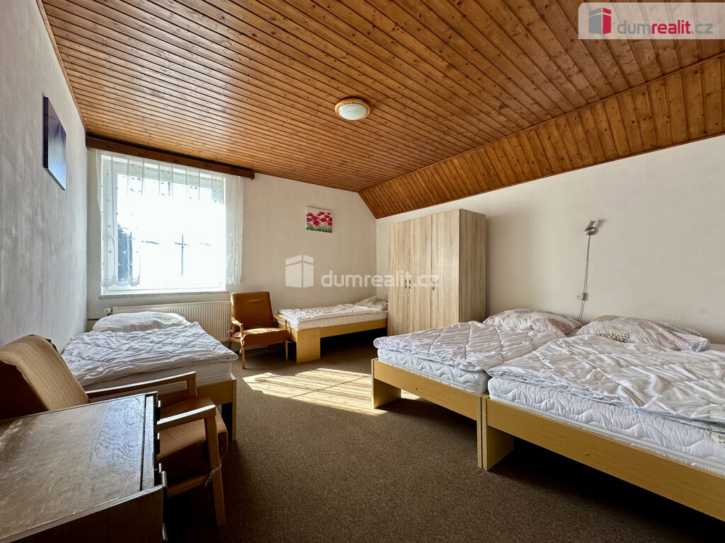 Dvoupodlažní dům s podkrovím nabízí v přízemí prostornou kuchyň, obývací místnost, dvě toalety, technickou místnost a vstupní část. Ve druhém podlaží jsou dvě obytné místnosti, každá s vlastní koupelnou a toaletou. Podkroví tvoří jednu obytnou místnost s koupelnou a toaletou. Dům byl kolaudován v roce 2003, je napojen na obecní vodovodní řad a kanalizaci. Vytápění domu je plynové s nízkými náklady a to díky polystyrenovému zateplení o síle 15cm. Střešní krytina na domě Tegola. Před domem je možné posezení a to na zahradě o rozloze 331m². Dům je situován na pozemku o celkové ploše 408m² na okraji obce s výhledem do zeleně a nic nerušícím okolí. Tato nemovitost nabízí mnoho možností využití a je ideální pro ty, kteří hledají lukrativní investici, nové podnikání v oblasti ubytování nebo klidné rodinné bydlení. Pernink je krásné horské městečko, které je celoročně navštěvováno turisty. V blízkosti se nachází lyžařská střediska jako je Klínovec, Plešivec nebo Boží Dar. Je zde využití jak v zimě pro běžkaře, tak v létě pro cyklisty s velkým množstvím cyklotras a sjezdů. Pro děti je zde lanová dráha, bobová dráha nebo Ježíškova cesta na Božím Daru.