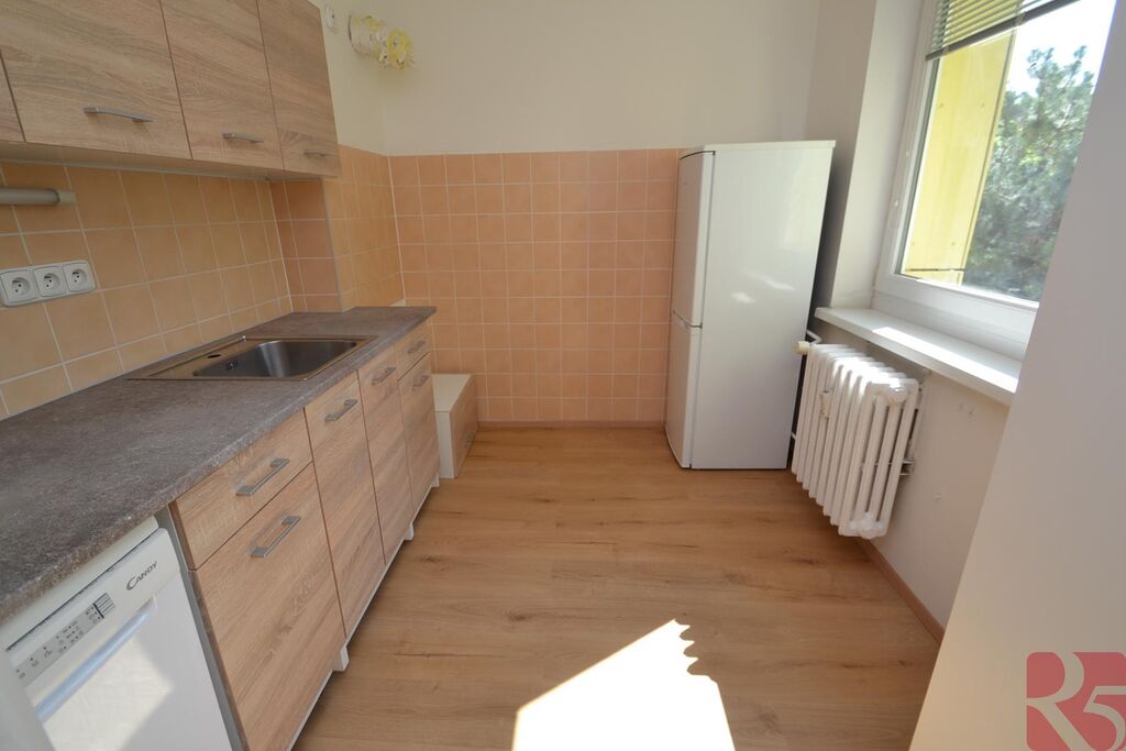 Byt 2kk se vstupní chodbou, kde najdete velkou šatní skříň a druhou příruční o vstupu do ložnice. Z chodby vstup do koupelny s vanou a pračkou, samostatné toalety, ložnice a obývacího pokoje ze kterého je vstup na lodžii a do oddělené kuchyně s novou kuchyňskou linkou vybavenou myčkou, sporákem (bude dokoupen) nad kterým bude skříňka s odsavačem par (také bude dokoupeno), dále lednice s mrazákem a velká potravinová skříň. Kuchyň má vlastní okno na jižní stranu, okna obývacího pokoje a ložnice před kterými je prostorná lodžie jsou na západ.