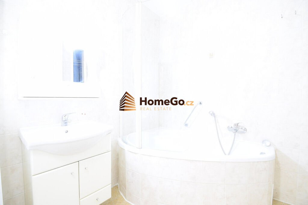 • koupelna s rohovou vanou, umyvadlem a místem na pračku