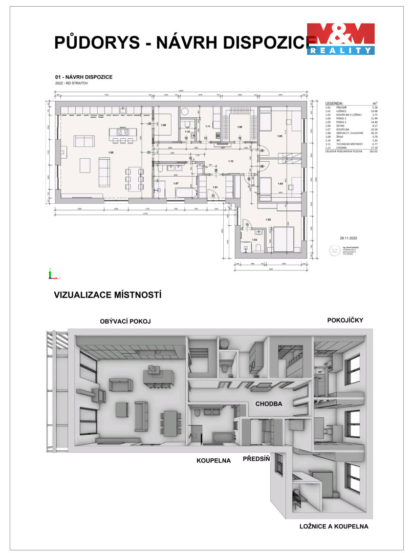 Součástí nabídky je stavební povolení a projektová dokumentace na výstavbu moderního rodinného domu 4+kk s podlahovou plochou 162 m². RD je navržen ve tvaru písmene L – jednopodlažní, nepodsklepený, zděný z keramických bloků.