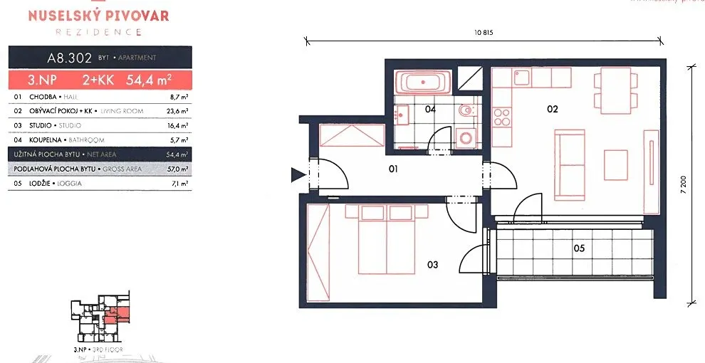 Jedná se o slunný byt o dispozici 2+KK s lodžií 7 m², orientovanou na jih, umístěný v 3.NP s výtahem. Dostatek denního světla v bytě je zajištěn velkými okny, která jsou jak v prostoru obývací části, tak i v ložnici. Na lodžii je přístup jak ložnice, tak z obývací části.