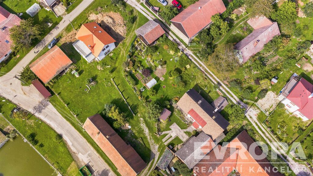 Dominantou domu je krásná udržovaná oplocená zahrada na níž stojí dřevěná kůlna a cihlová stavba (přídomek) ve velmi dobrém stavu s prostory bývalých chlévů a oddělená garáž na jeden OA. Na zahradě v zemi je nádrž o velikosti 1000l na dešťovou vodu.