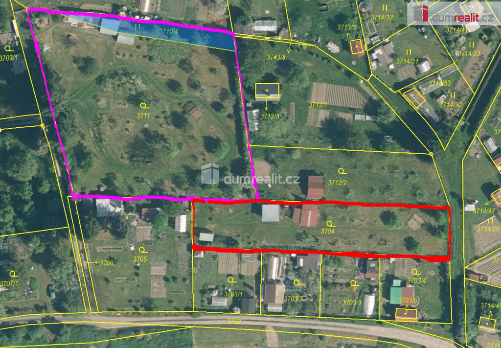 prodej rozlehlé udržované zahrady / sadu se vzrostlými, plodícími, ovocnými stromy, o rozloze cca 3000 m² (na plánku označeno fialovou barvou) v oblíbené, zavedené zahrádkářské kolonii na okraji města Tachov.