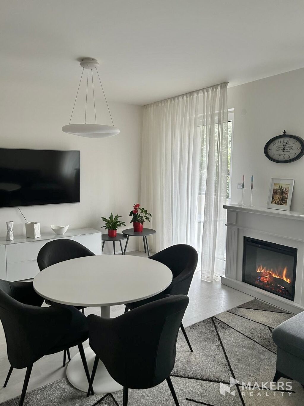 Interiér bytu je promyšleně řešený a nabízí vše potřebné pro pohodlné bydlení. Otevřený obytný prostor je vybaven moderní kuchyňskou linkou se spotřebiči – elektrickou troubou, varnou deskou, lednicí, rychlovarnou konvicí a toustovačem. Součástí je také jídelní kout se stolem a čtyřmi židlemi, pohodlná rohová rozkládací sedačka, televize a stylový elektrický krb, který interiéru dodává útulnou atmosféru.