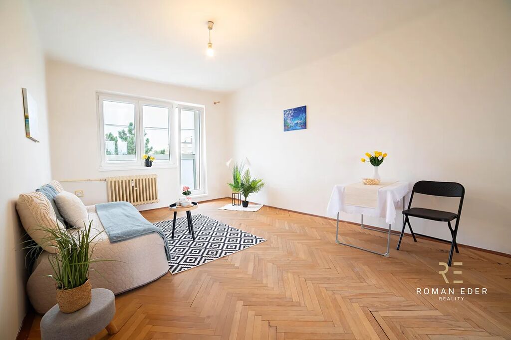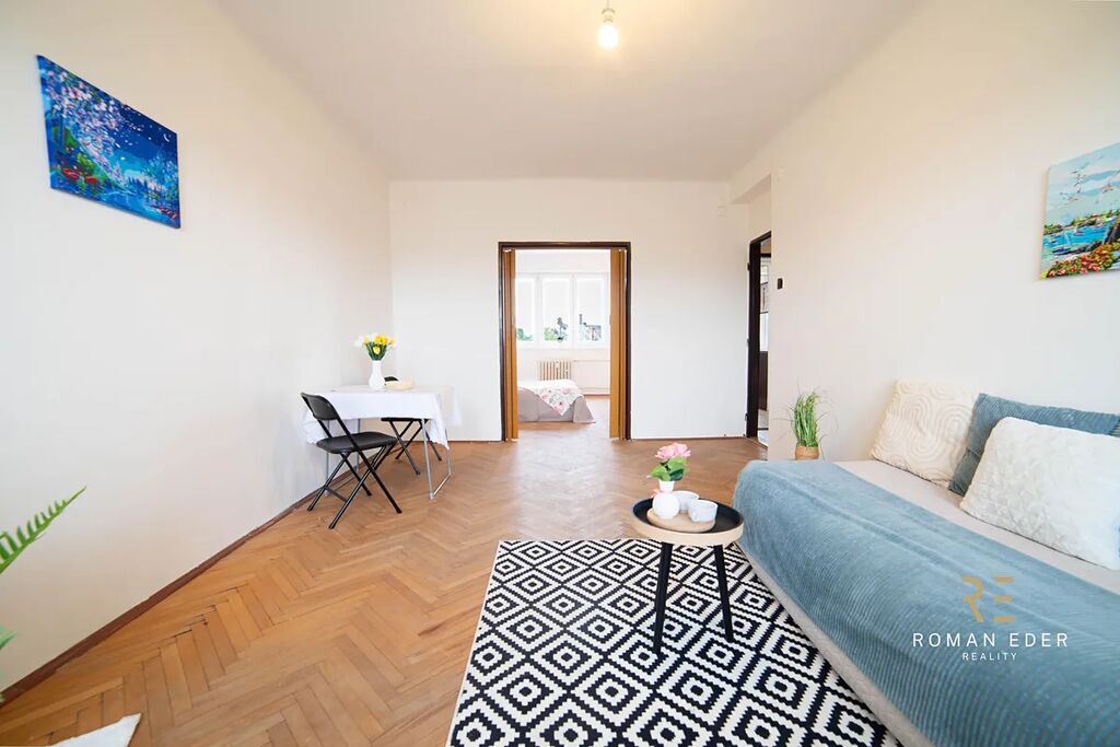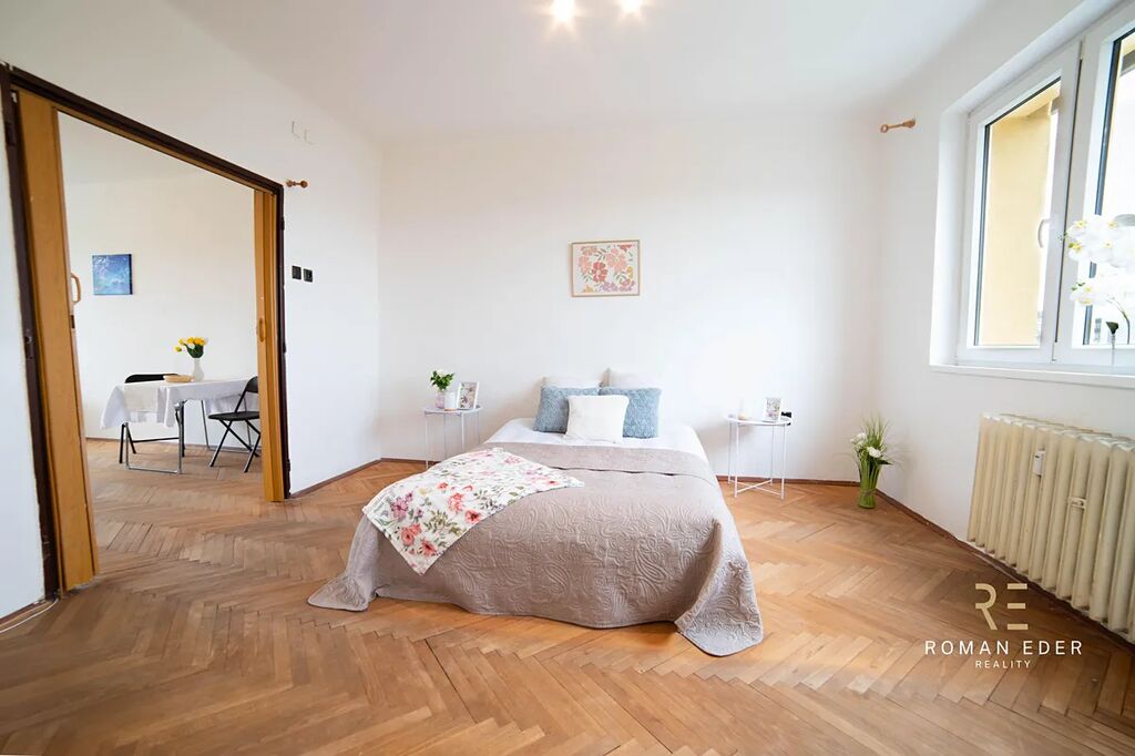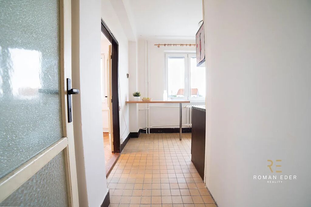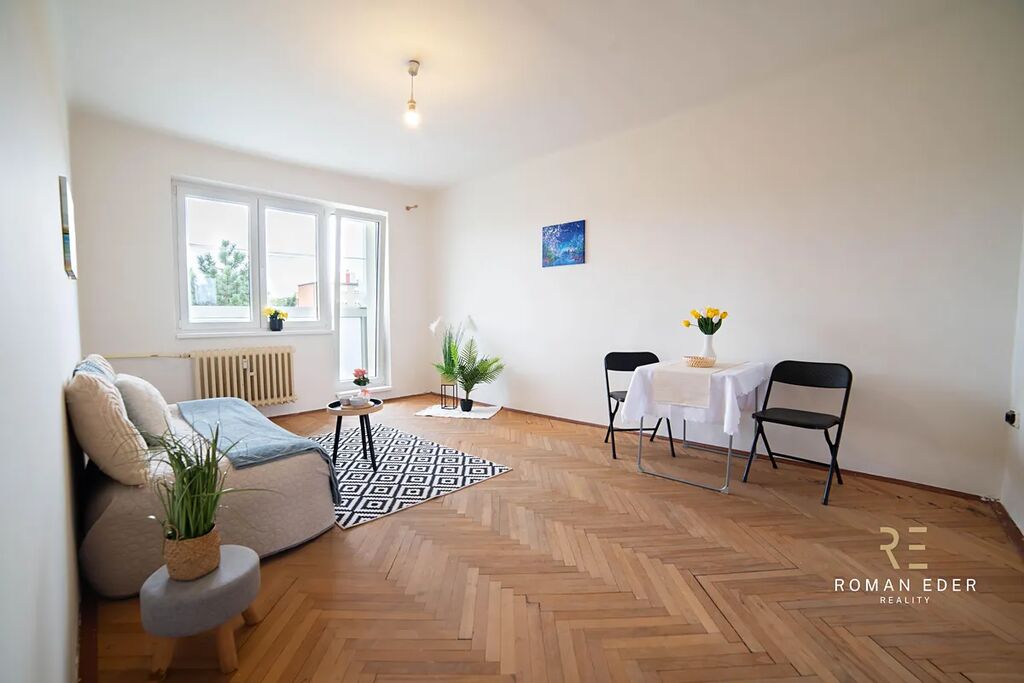 Byt je v původním stavu a čeká na rekonstrukci. Výhodou tedy je, že si ho můžete přizpůsobit přesně podle svých potřeb, vkusu, a hlavně finančních možností. Byt tvoří útulný obývací pokoj se vstupem na zasklenou lodžie, ložnice, malá kuchyn s oknem , koupelna s vanou, samostatné WC a chodba. K bytu náleží také sklepní kóje. Na podlahách v pokojích jsou dřevěné parkety, které dodávají interiéru příjemnou atmosféru.