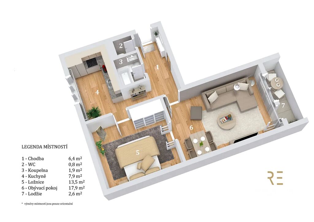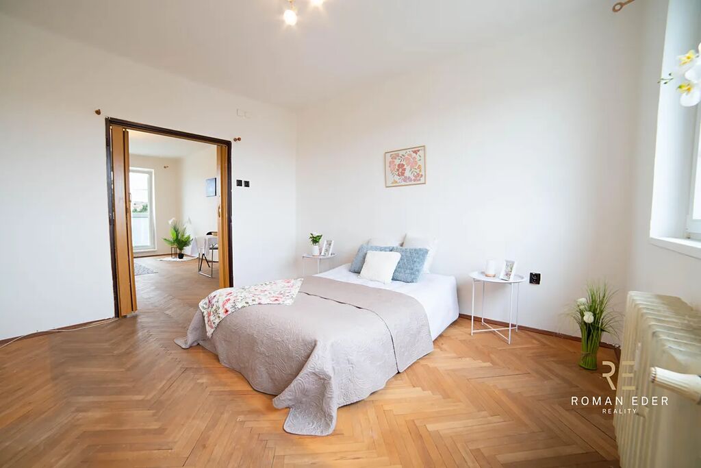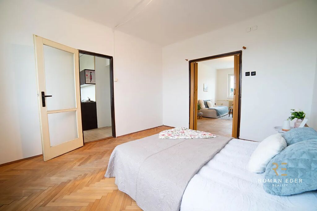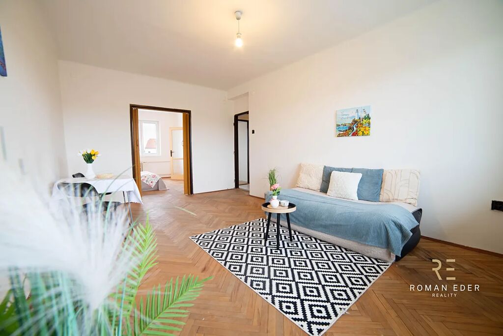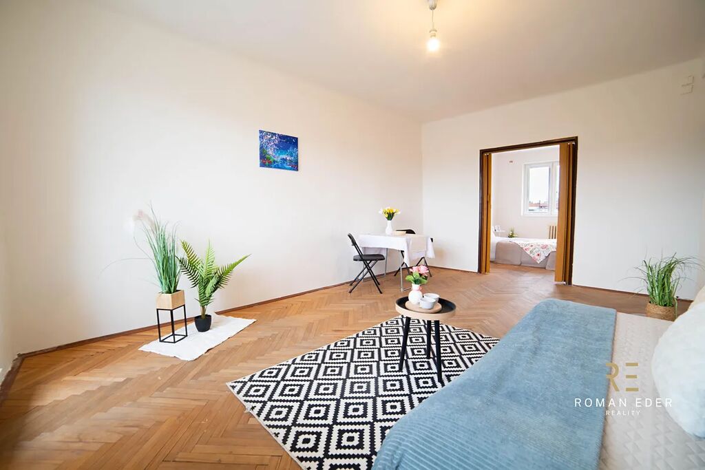 Byt je v původním stavu a čeká na rekonstrukci. Výhodou tedy je, že si ho můžete přizpůsobit přesně podle svých potřeb, vkusu, a hlavně finančních možností. Byt tvoří útulný obývací pokoj se vstupem na zasklenou lodžie, ložnice, malá kuchyn s oknem , koupelna s vanou, samostatné WC a chodba. K bytu náleží také sklepní kóje. Na podlahách v pokojích jsou dřevěné parkety, které dodávají interiéru příjemnou atmosféru.