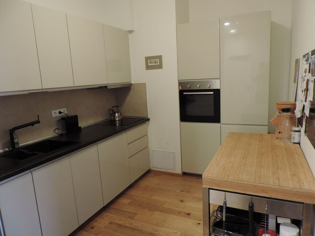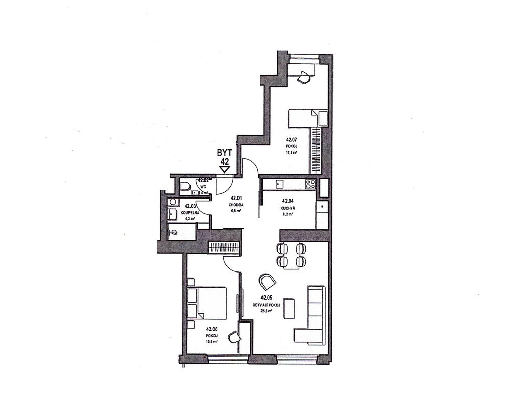 Moderní byt se nachází ve 3. patře zrekonstruovaného domu s výtahem v centru Dejvic a sestává ze tří samostatných pokojů (25,4m²+17,8m²+15,6m²) a vybavené kuchyně (8m²), dále je součástí bytu chodba, koupelna se sprchovacím koutem a samostatné WC. K bytu náleží sklepní kóje (2,7m²) v suterénu domu.