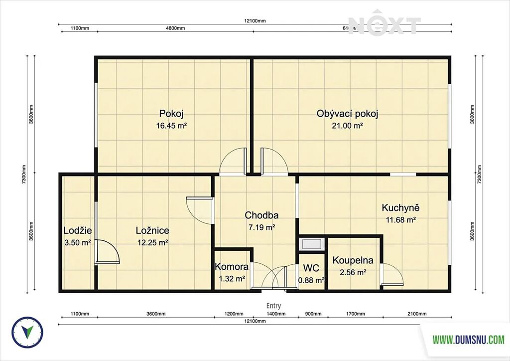 Po vstupu do bytu vás přivítá chodba s komorou a samostatnou toaletou. Z chodby se dostanete do ložnice s přímým vstupem na lodžii, dále do prostorného pokoje, který se hodí jako dětský pokoj nebo pracovna, a také do velkého obývacího pokoje s jídelním koutem. Na obývák navazuje samostatná kuchyně, hned za ní je umístěná koupelna.