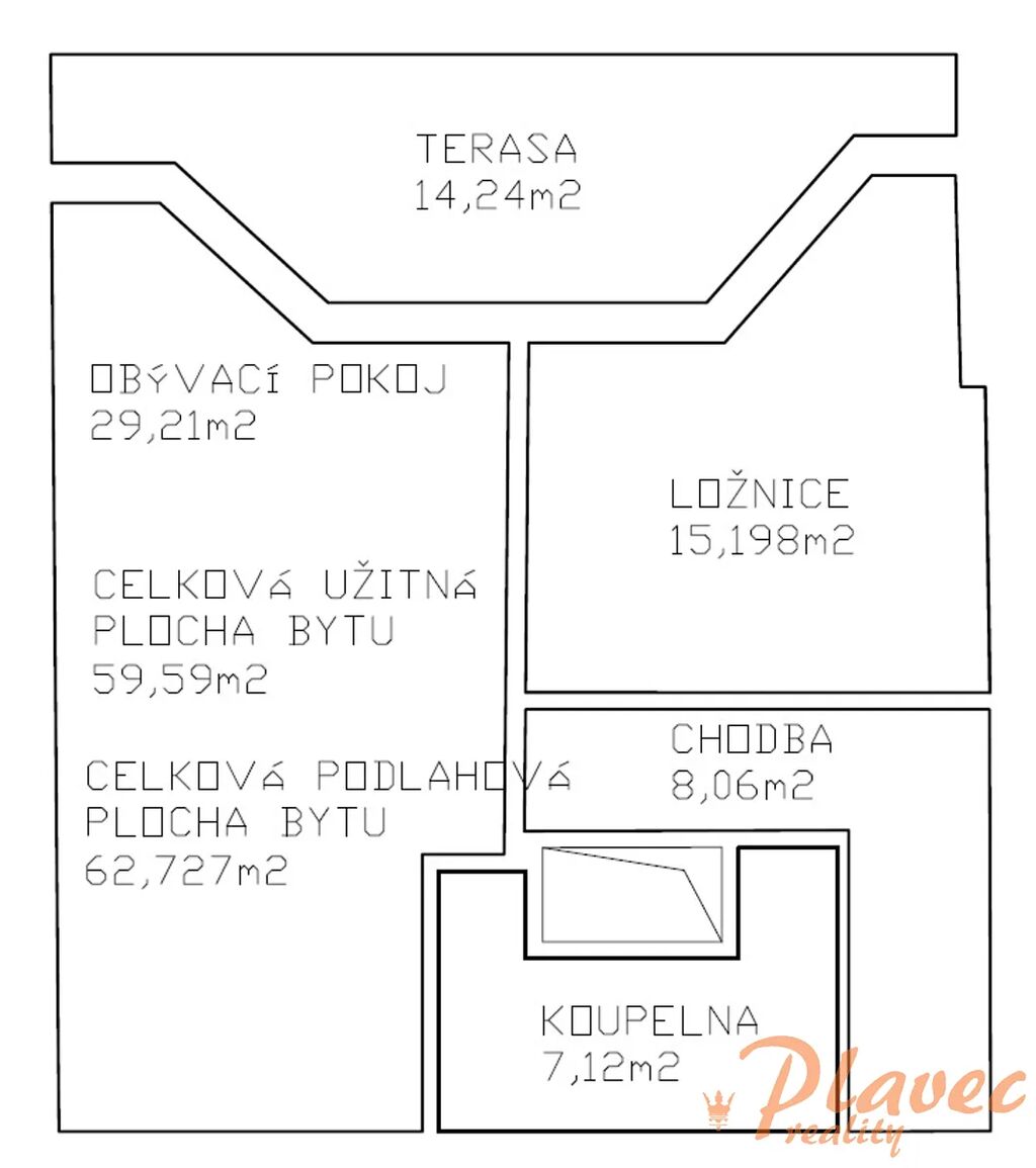 Dispozice: vstupní chodba, obývací pokoj s kuchyňským koutem a komorou, ložnice, terasa se vstupem z obou pokojů, koupelna s vanou v kombinaci se sprchovým koutem, toaleta. Sklep v suterénu domu.