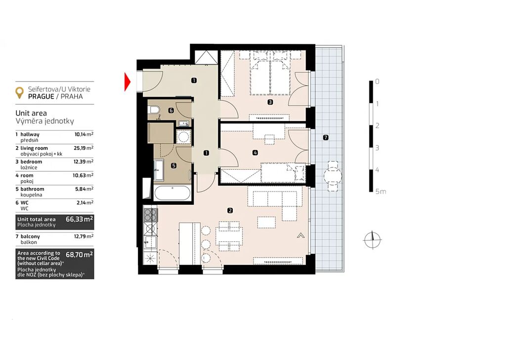 A superior 3+kitchen apartment with an area of 68 m2 with a spacious balcony of almost 13 m2 and a cellar of 4.2 m2 in the popular location of Žižkov. The apartment is located on the 3rd floor of a new building, oriented to the east and south. All rooms face a quiet green garden and the living room is sunny from the south as well thanks to the side windows.