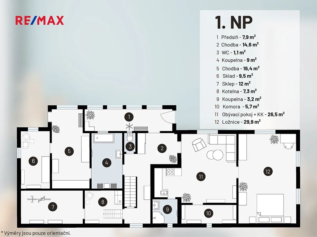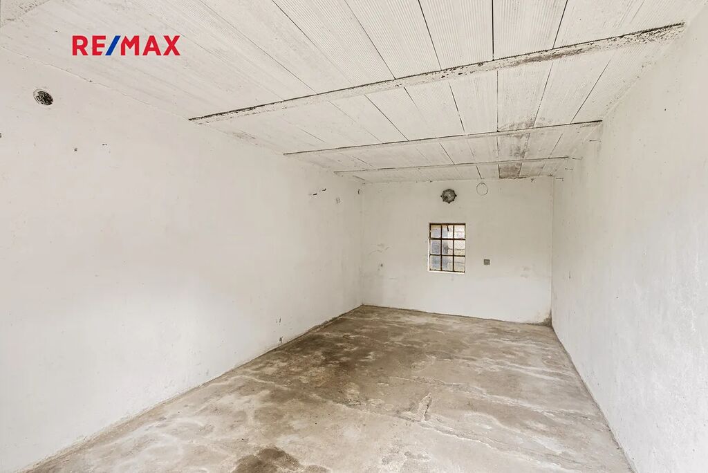 • Předsíň, chodba, WC, koupelna, chodba, kuchyň spojená s obývacím pokojem, ložnice, komora + skladovací a sklepní prostory.