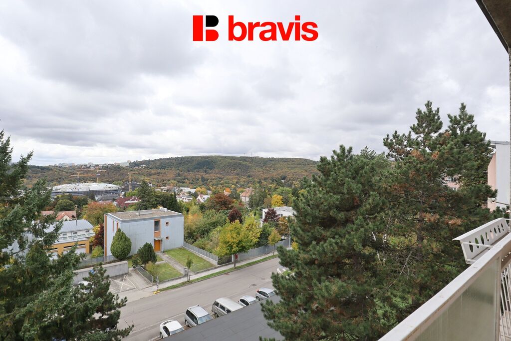 Obývací pokoj (24 m2) se vstupem na balkon je zařízený obývací stěnou a je orientován do ulice Neumannova s krásným výhledem na Brno.