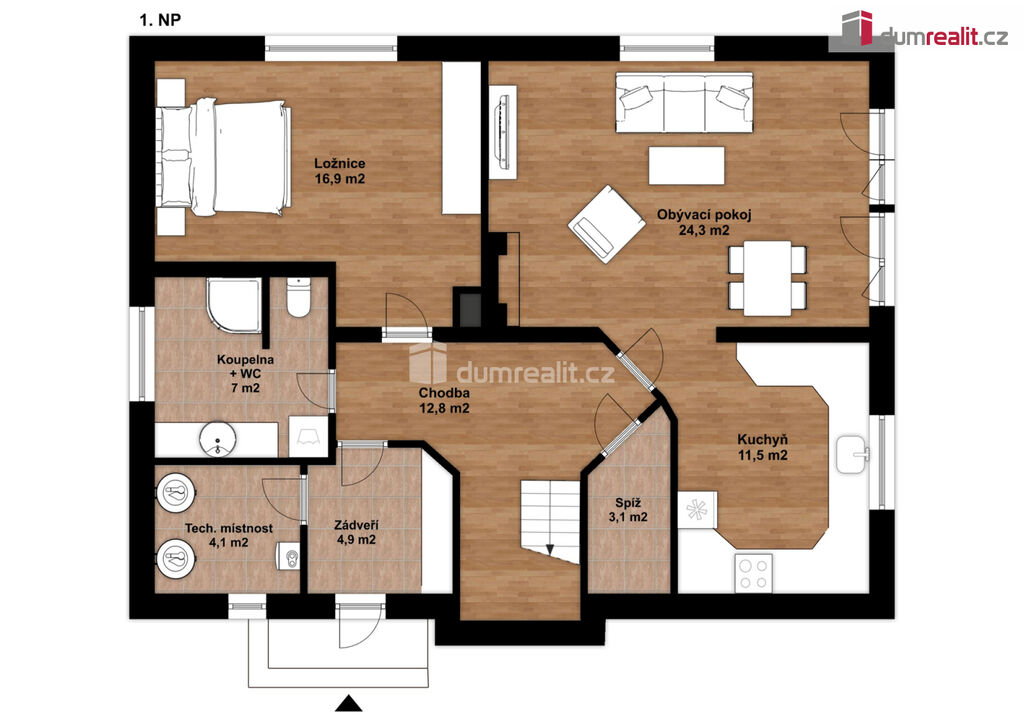 Dumrealit.cz Vám zprostředkuje ve výhradním zastoupení prodej rodinného domu, který se nachází v katastrálním území Líšno, obec Bystřice. Dům 7+KK, o podlahové ploše 168 m² se rozprostírá na pozemku o celkové výměře 811 m², dosud veden jako rozestavěná stavba, přestože od roku 2010 byl obýván. Stavba není dosud zkolaudována. Vnitřní prostory domu jsou v zásadě dokončené. Dispozičně se jedná o dvoupodlažní rodinný dům s částečně obytným podkrovím. V přízemí se nachází vstupní chodba, technická místnost s ovládáním čerpadla a úložnými prostory, koupelna se sprchovým koutem a WC, ložnice, dále prostorný obývací pokoj propojený s kuchyní, u které je i prostorná spíž. Kuchyňská linka byla zhotovena na míru kuchyňským studiem. Z obývacího pokoje vede francouzské okno na zahradu. Schodiště v domě má kovovou konstrukci s dřevěnými schodnicemi a je situováno uprostřed domu. V patře se nacházejí tři dětské pokoje, z nichž každý má navazující spací prostor v podkroví (mezonetové řešení). Dále je zde menší pokoj pro hosty, samostatné WC a koupelna s vanou, dvěma umyvadly a dalším WC. Okna v domě jsou plastová, střešní okna značky Velux jsou dřevěná. Vytápění domu zajišťuje tepelné čerpadlo s možností přepnutí na elektrické topení. V přízemí je podlahové vytápění doplněné radiátory, v patře jsou radiátory. Dům je napojen na vlastní studnu, možnost snadného připojení na obecní vodovod, vše již připraveno. Odpady jsou svedeny do jímky, která je na sousedním pozemku, tudíž je nutnost vybudování vlastní jímky. V obci není zatím vybudovaná kanalizační síť. Z venkovní strany domu chybí dokončení fasády – dům nemá vnější omítky. Zahrada byla původně částečně upravená, v současnosti je bez zásadní údržby. Okolí domu tvoří rodinné domy, jedná se o klidnou část s blízkostí přírody a lesa. Město Bystřice vzdálené 1, 5 km nabízí veškerou občanskou vybavenost, včetně mateřské a základní školy, zdravotnické zařízení, poštu, banku, úřad, vlakové a autobusové spojení na Benešov, Prahu, Tábor. Přípojka na rychlostní komunikaci Praha – České Budějovice pouhé 2 km od domu. Tato nabídka je vhodná pro početnější rodinu, která si chce každodenně užít oázu klidu a maximální soukromí. PENB není vyhotoven, proto uvádíme hodnotu G. Doporučuji osobní prohlídku! V případě zájmu velice rádi pomůže se zprostředkováním financování. Pro více informací volejte na uvedené telefonní číslo. Ev. číslo: 652760.