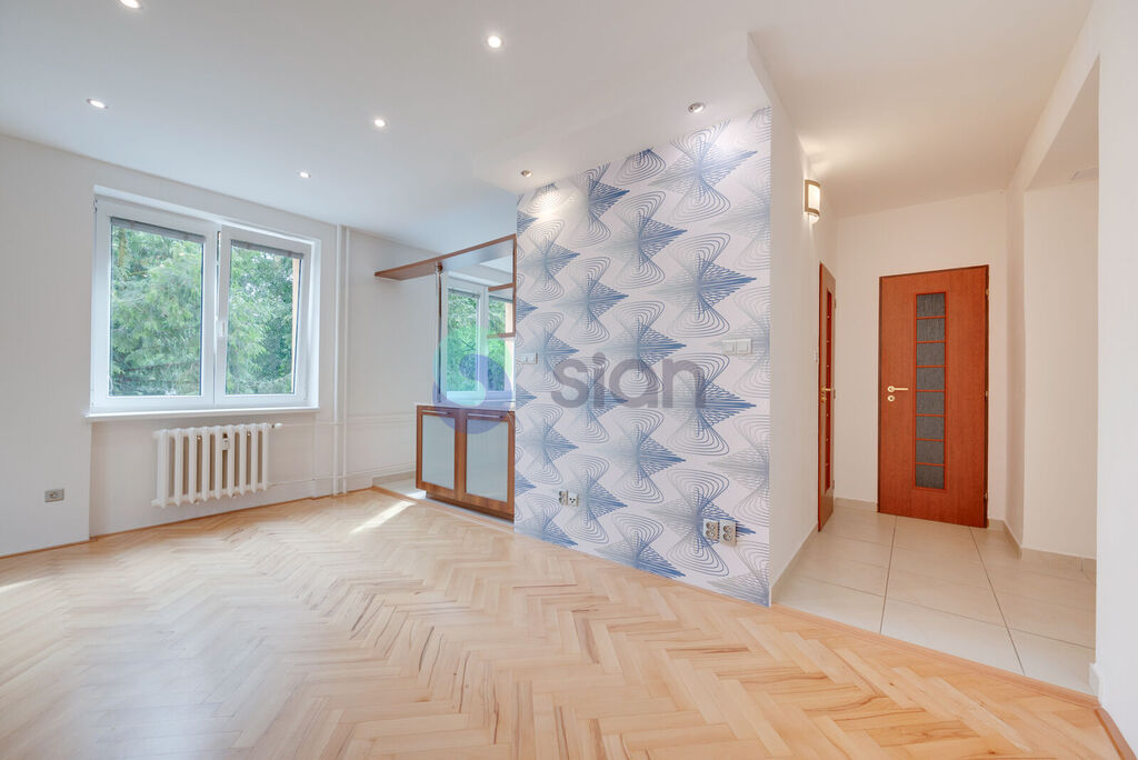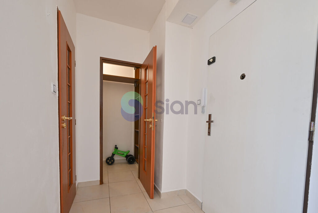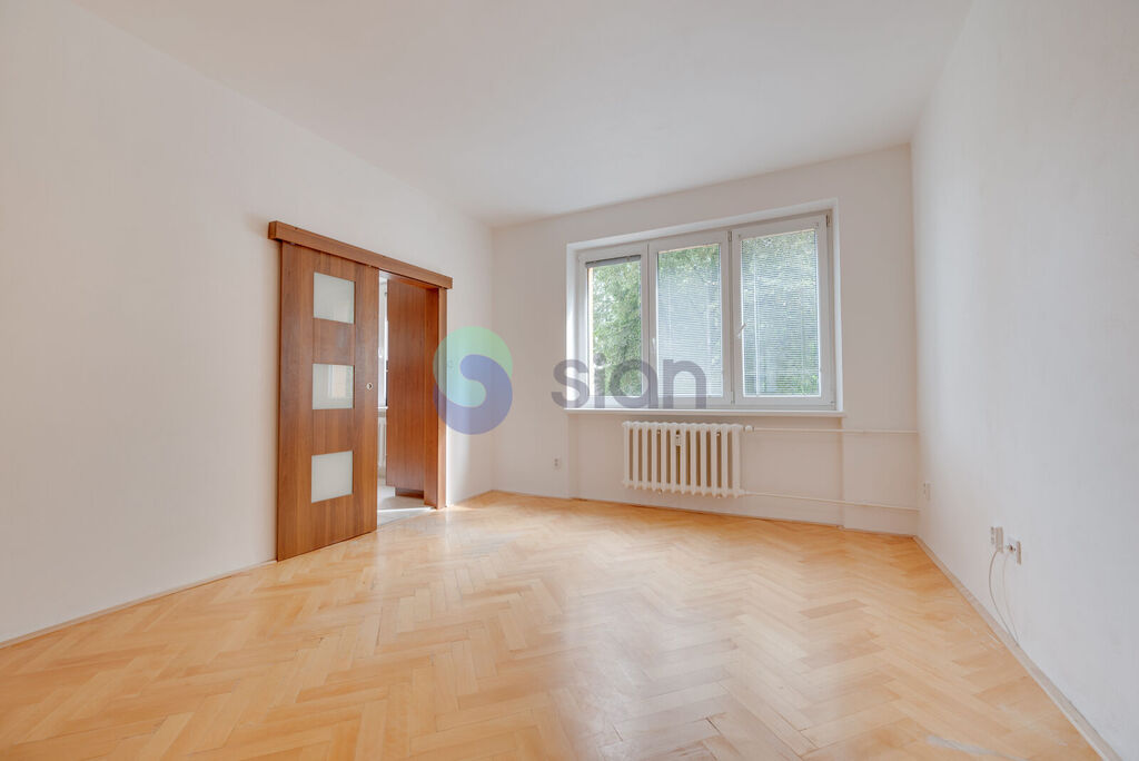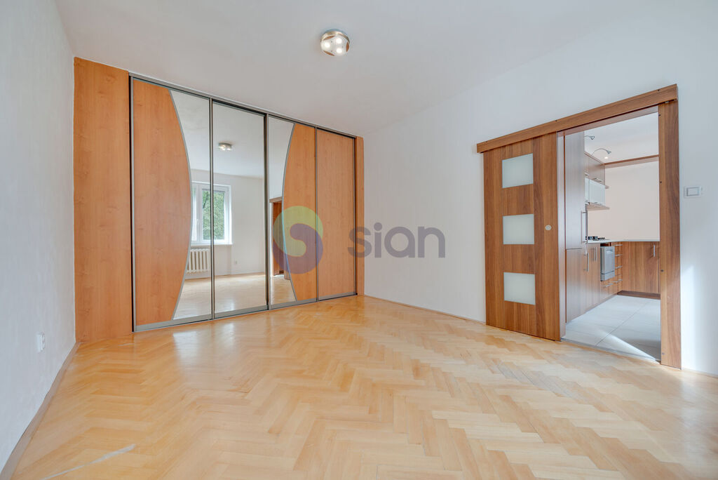 Velmi praktická dispozice bytu: dva větší pokoje, obývací pokoj je organicky spojen s kuchyní. Zadní neprůchozí pokoj – ložnice – disponuje obrovskou vestavěnou skříní přes celou zadní stěnu. Další úložné prostory poskytuje uzavíratelná komora hned u vstupních dveří s vestavěným policovým systémem.