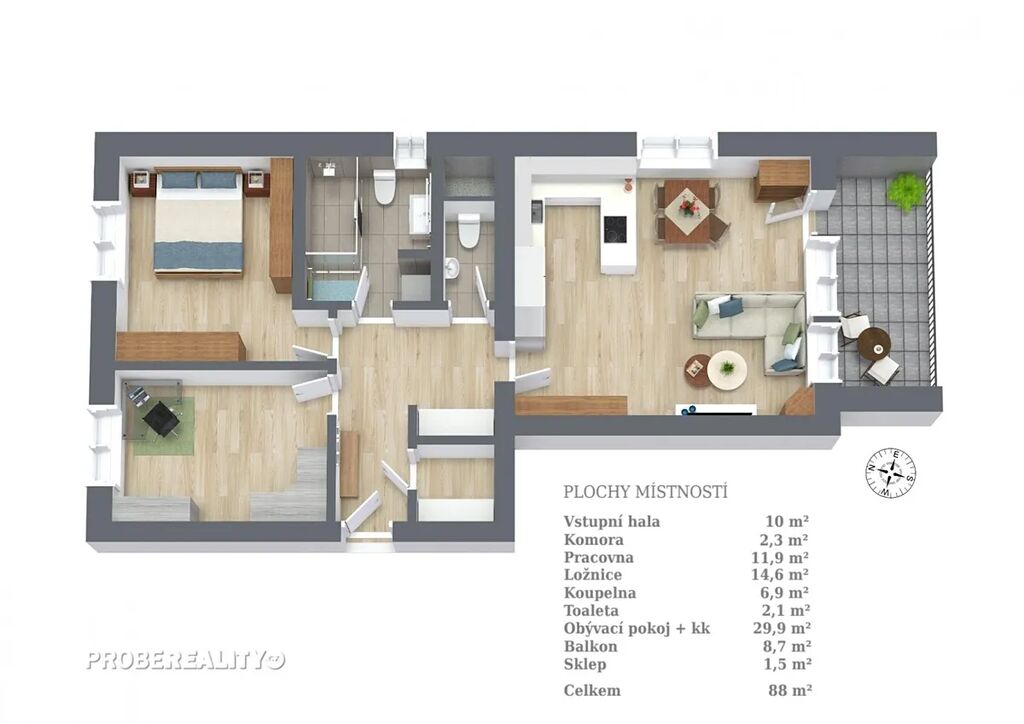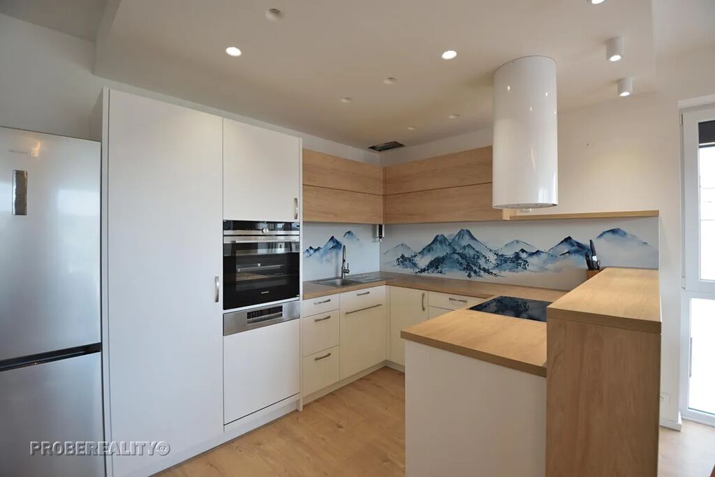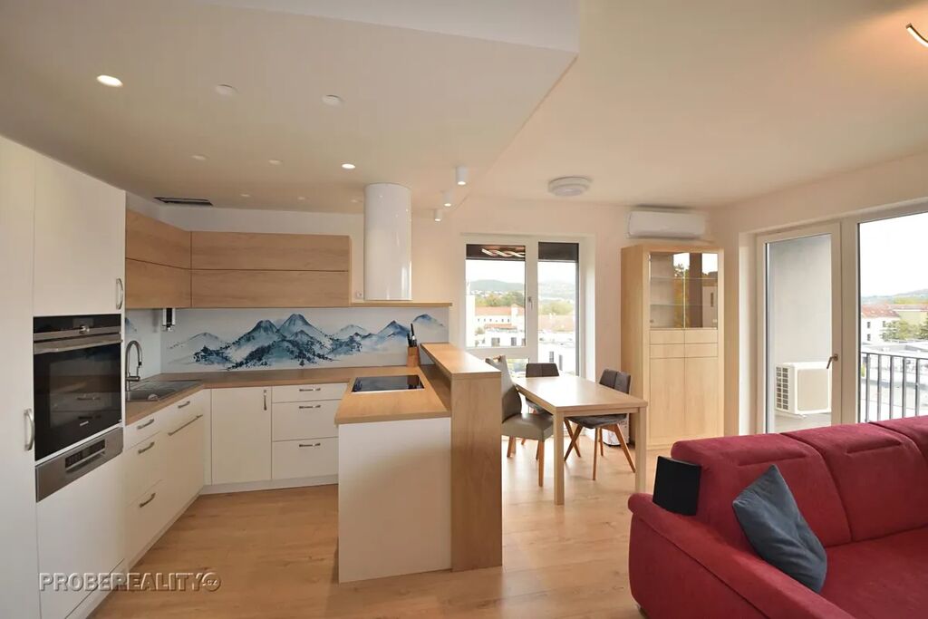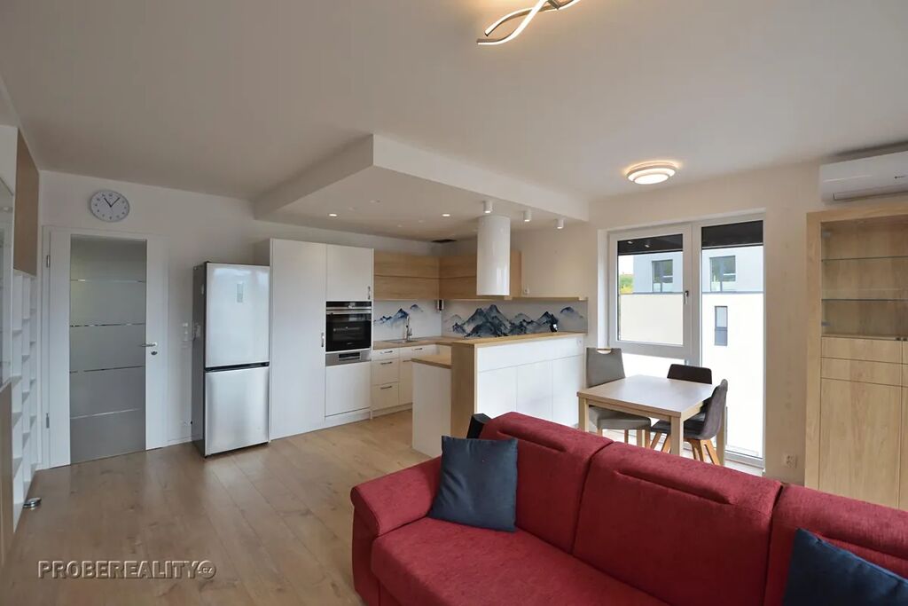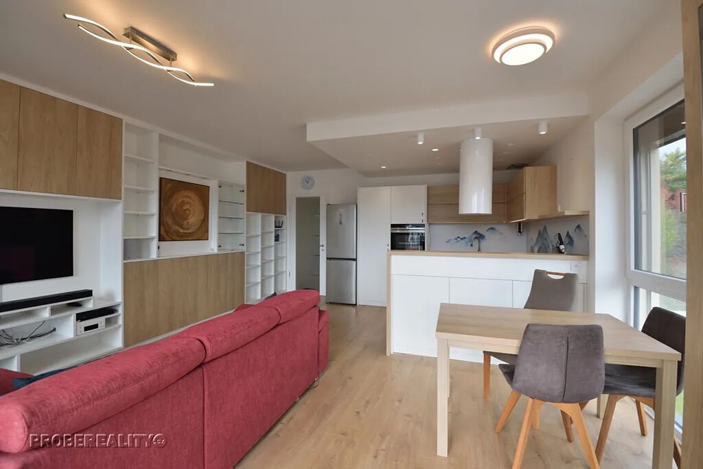 Byt má užitnou plochu 78 m2, balkon 9 m2 a sklep 1,5 m2. Je vybaven novým nábytkem a kvalitními spotřebiči kuchyňská linka se značkovými spotřebiči Siemens (indukční varná deska, trouba, myčka, digestoř) a lednicí s mrazákem Bosch. V obývacím pokoji je televize LG (100 cm) s audio soustavou a nástěnná klimatizace. Ve všech pokojích jsou položeny kvalitní vinylové podlahy. Obývací pokoj s balkonem je orientován na jih, dva další pokoje směřují na sever do klidné zeleně. Koupelna je vybavena sprchovým koutem, pračkou a sušičkou Miele, toaleta je samostatná. Součástí bytu je komora a vestavěná skříň v chodbě, které poskytují dostatek úložného prostoru. K bytu náleží sklep v přízemí budovy a parkovací stání v uzavřeném areálu s přístupem na čip.