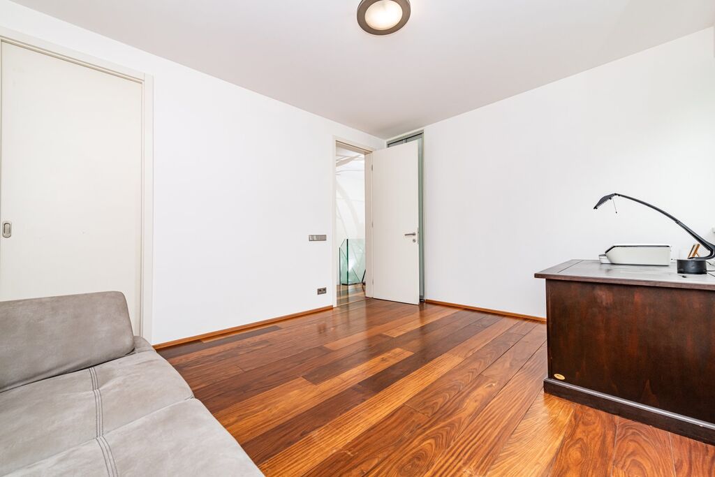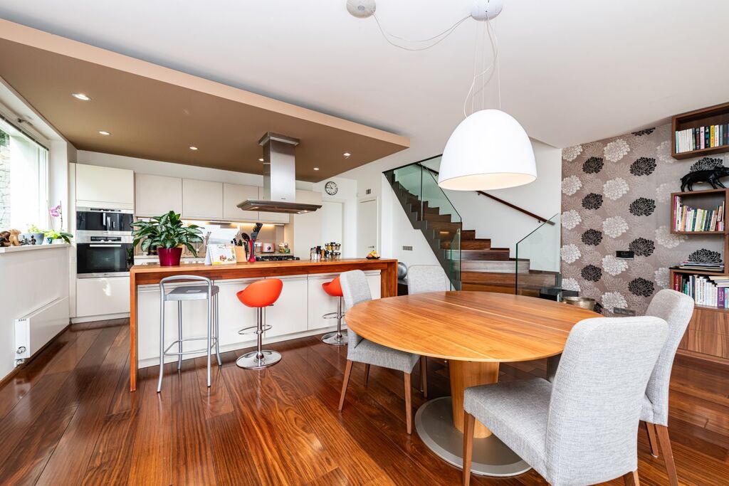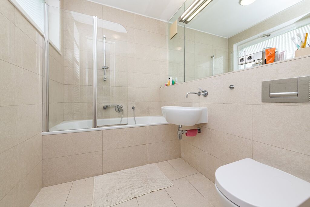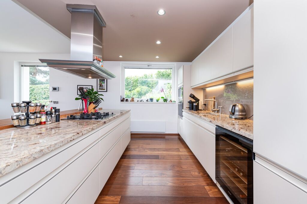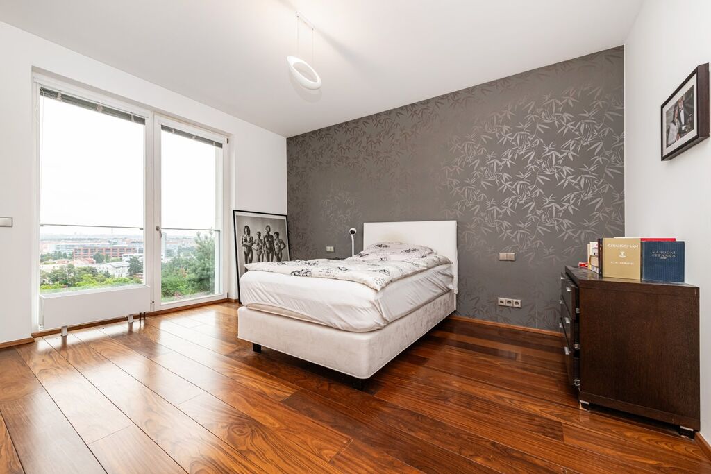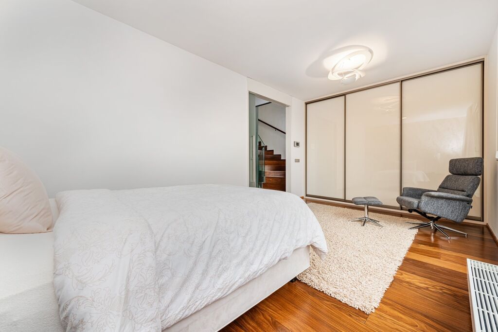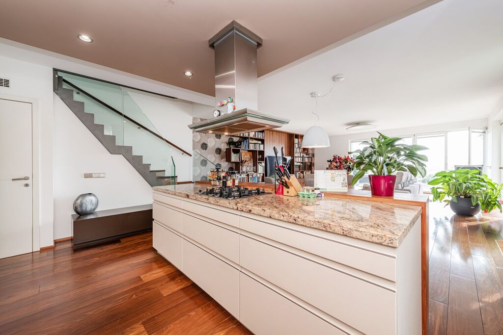 Dům (polovina dvojdomu) je rozdělen do tří obytných úrovní. Vstupní patro nabízí zádveří s vestavěnou skříní, chodbu, ložnici s přímým vstupem na terasu a s nádherným výhledem na Prahu a Pražský hrad, koupelnu se sprchovým koutem, toaletou a infrasaunou a také vstup do garáže. V horním patře se nachází hlavní ložnice s vlastní koupelnou (sprcha, bidet, toaleta) a šatnou, dále druhá ložnice s vlastní koupelnou (vana, toaleta), chodba a technická místnost s plynovým kotlem. V přízemním patře s přímým vstupem na terasu a do zahrady se rozprostírá otevřený prostor (66 m²), který tvoří obývací pokoj propojený s jídelní částí a s kuchyní. Kuchyň je vybavena varným ostrůvkem a kvalitními spotřebiči Miele – plynová varná deska, parní trouba, digestoř, lednice, mrazák, myčka a vinotéka. Je zde také spíž, dvě technické místnosti, sklad a samostatná toaleta.