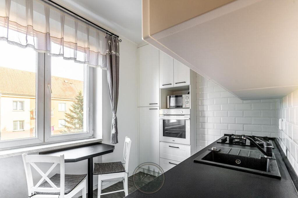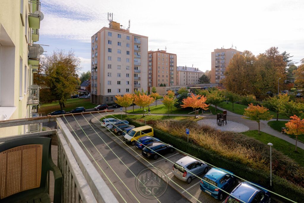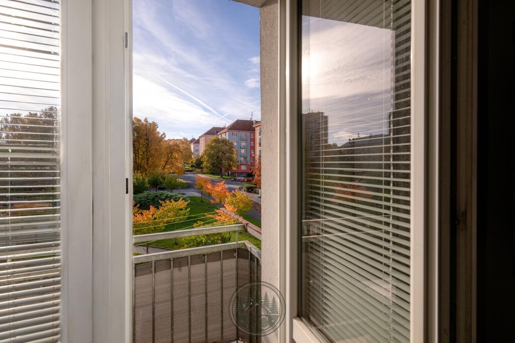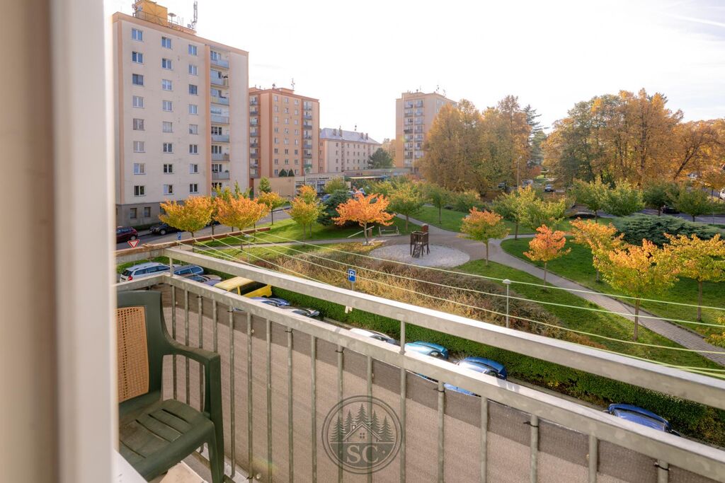 Z balkonu je nádherný výhled na náměstí SNP a dětské hřiště, zatímco z kuchyně a ložnice se otevírá pohled do zeleně.