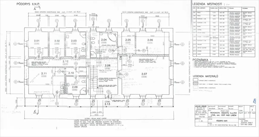 II.NP – schodiště, pokoj, pokoj, koupelna s WC, šatník, ložnice s vlastní koupelnou a WC, samostatný byt 1KK s předsíní a koupelnou s WC, velká místnost (herna), chodba, lodžie po celé délce domu. Z lodžie je možný vstup do vedlejší stodoly (garáž) s podkrovní hernou (pánský klub) a venkovním posezením s krbem.