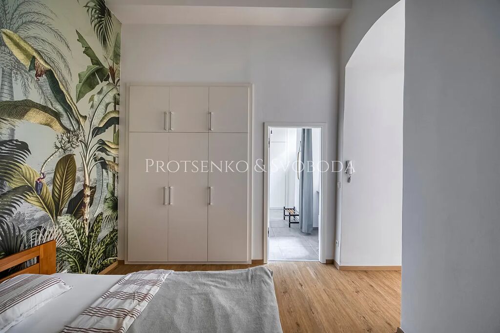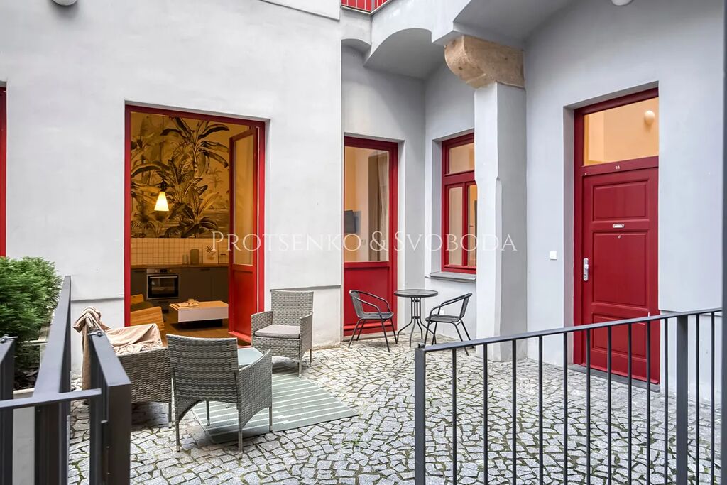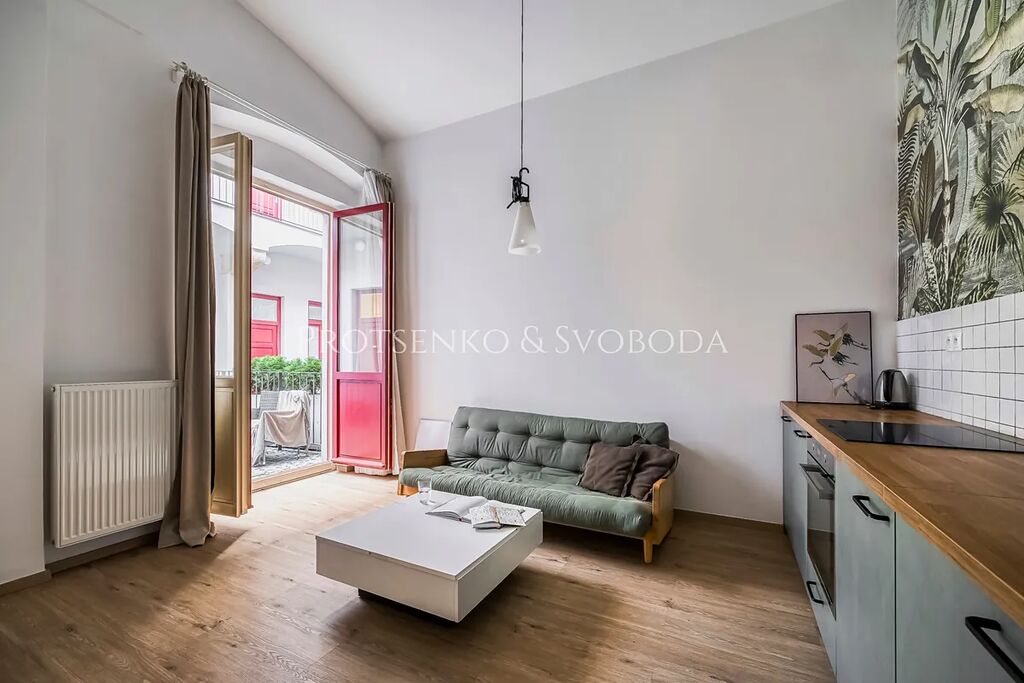 Realitní kancelář Protsenko & Svoboda si dovoluje nabídnout k prodeji kompletně vybavený byt o dispozici 2+kk, který díky své poloze v přízemí a přímému vstupu z ulice může sloužit nejen jako útulné bydlení, ale i jako reprezentativní kancelář. Samotná podlahová plocha činí 53 m², k bytu náleží předzahrádka o velikosti 20 m² a sklepní kóje (2 m²).