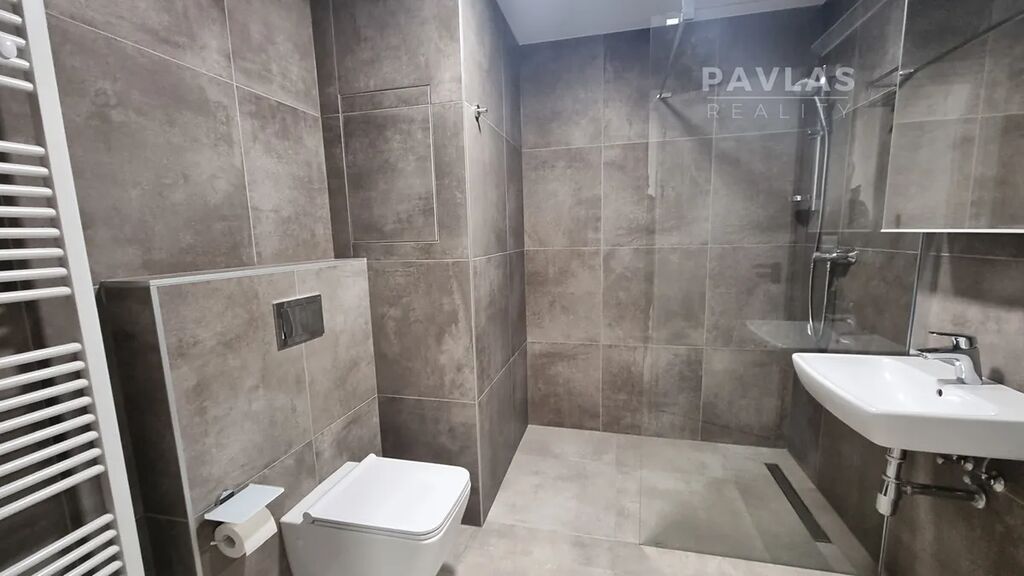 Byt je navržen tak, aby poskytoval maximální komfort. Dispozice zahrnuje vstupní chodbu s prostorem pro šatní skříň, světlý a prostorný obývací pokoj s moderním kuchyňským koutem vybaveným elektrospotřebiči, myčkou, vestavnou lednicí a mrazákem. Koupelnu se sprchovým koutem, umyvadlem a WC. Celý byt je vybaven podlahovým topením. Všechna okna jsou trojskla s předokenními žaluziemi. Součástí pronájmu je také skladovací kóje na patře bytu.