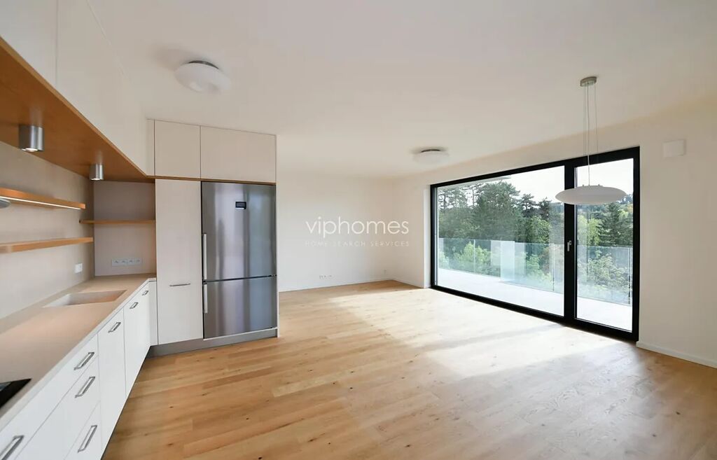 Byt je umístěn v posledním patře domu s velkou terasou, která skýtá soukromí a s další terasou u ložnice s výhledem do lesoparku. Obývací pokoj je propojen s moderní kuchyňskou linkou vybavenou kvalitními spotřebiči (el. keram. deska, lednice s mrazákem, myčka, digestoř, el. trouba, mikrovlnná trouba).