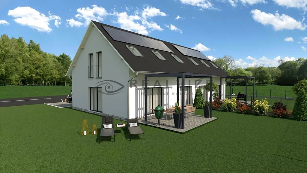Nabízíme k prodeji pravou polovinu moderního dvojdomu o dispozici 5+1 s užitnou plochou cca 123 m² na pozemku o rozloze cca 433 m², situovanou v klidné části obce Ločenice, přibližně 20 km jižně od Českých Budějovic. Jednotka má vlastní vchod a samostatný pozemek, což zajišťuje dostatek soukromí. Dům bude dokončen na klíč nebo částečně, dle individuálních požadavků zákazníka. Je tedy ideální volbou pro ty, kteří si chtějí přizpůsobit vybavení a vzhled interiéru podle svých představ. Dispozice domu: Přízemí - prostorný obývací pokoj s kuchyňským koutem a jídelnou, pracovna, šatna, sklad, technická místnost se sprchovým koutem a WC. Podkroví: ložnice, dva dětské pokoje, šatna, koupelna a samostatné WC. Inženýrské sítě: elektřina je přivedena k objektu, dům je napojen na obecní vodovod a kanalizaci.