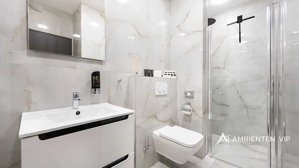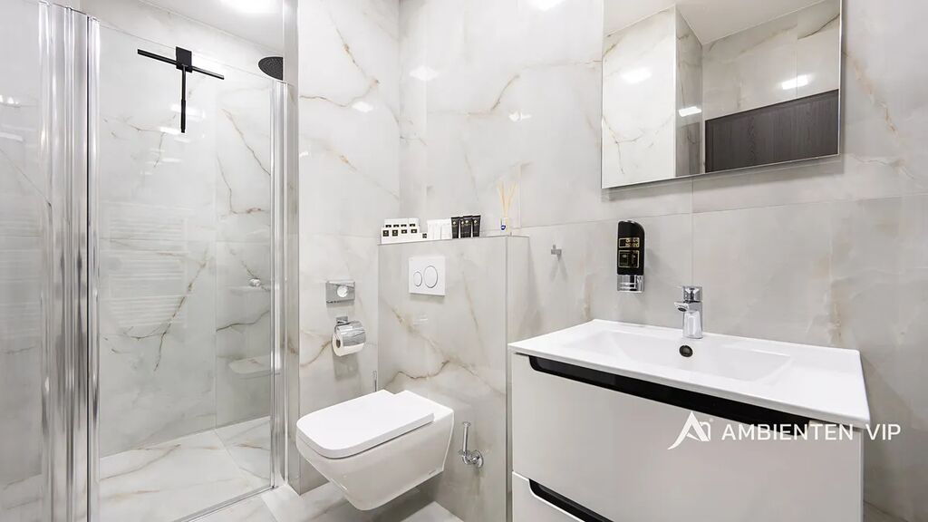 Ubytovací část tvoří čtyři samostatné byty s celkovou kapacitou až 20 hostů. Tři z jednotek jsou o dispozici 3+kk, čtvrtá o dispozici 1+kk. Každý byt disponuje plně vybavenou kuchyní, koupelnou, klimatizací a zatemňovacími venkovními žaluziemi. Všechny místnosti mají samostatný termostat pro regulaci teploty, vytápění je zajištěno teplovodním podlahovým topením a ohřev vody zajišťují elektrické bojlery (každá jednotka má vlastní se zásobníkem 125 L). K bytům patří dvě venkovní kuchyně a dvě vířivky – jedna pro 1+kk a druhá sdílená pro zbývající byty. U bytů je rovněž příprava pro případné doplnění sauny. Součástí této části nemovitosti je samostatný bazén o rozměru 6,5 × 4 metry. Každý byt má své podružné měřidlo elektřiny i vody, nemovitost má jednu hlavní přípojku elektřiny a vody.