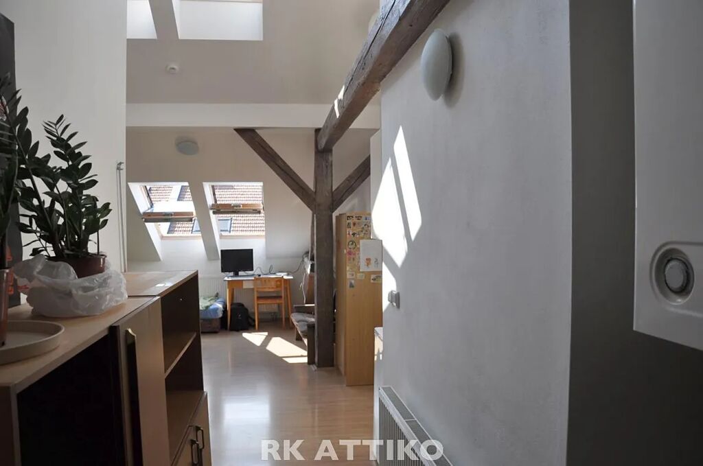 Pronájem půdního bytu 2+kk o ploše 53 m2, situovaném ve 4.patře bez výtahu, v cihlovém historickém domě po rekonstrukci, v klidné jednosměrné ulici u parku, nedaleko od centra - do pěší zóny centra jsou to tři zastávky tramvají nebo trolejbusem.