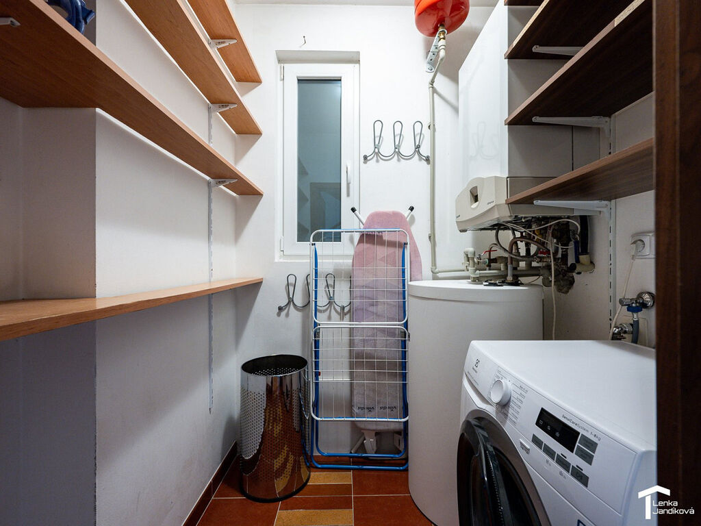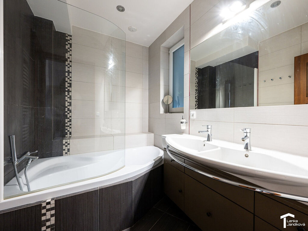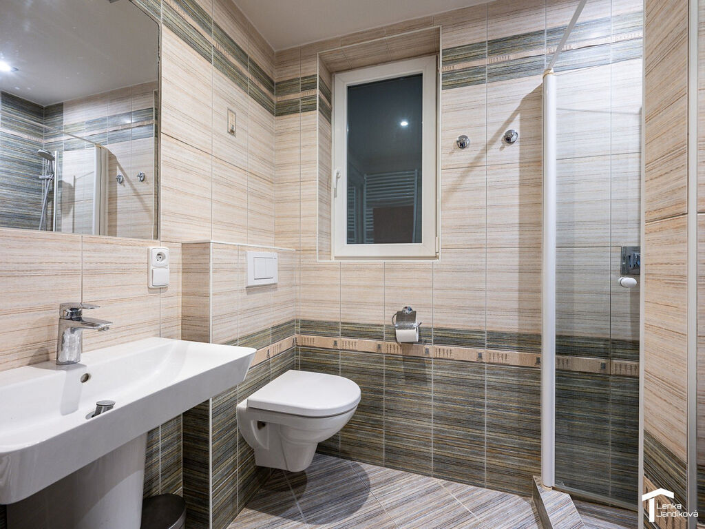 Po vstupu do bytu se ocitáme v prostorné chodbě, kde hned v zádveří je k dispozici vestavěná šatní skříň s botníkem. Vlevo vejdeme do světlého rozlehlého obývacího pokoje. Z chodby vpravo se nachází kuchyň s jídelnou. Kuchyňská linka je osazena vestavěnými spotřebiči ( myčka, elektrická trouba, plynová deska, mikrovlnná trouba, digestoř) a součástí nájmu je také jídelní stůl a židle. Na chodbě je dále vstup do koupelny. Ta je osazena sprchovým koutem a je spojená s WC. Vedle koupelny se nachází technická místnost, kde je umístěný plynový kotel pro vytápění bytu a bojler na ohřev vody.