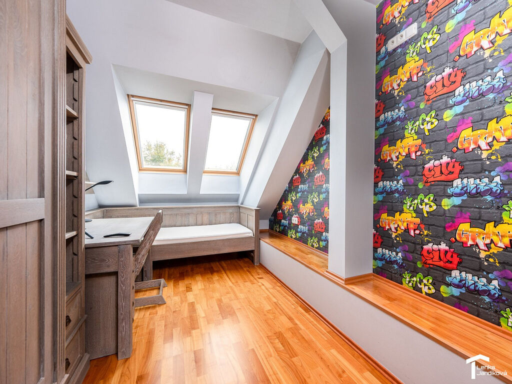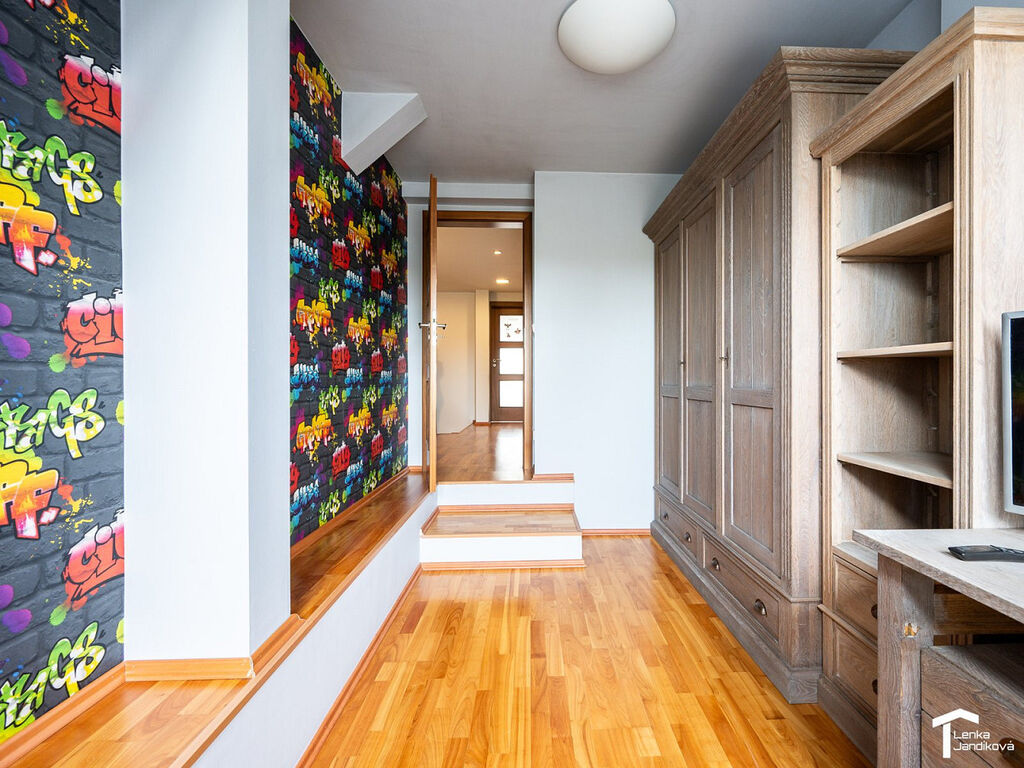 V prvním patře jsou tři samostatné pokoje, dále koupelna s rohovou vanou a samostatné WC. Na chodbě jsou k dispozici vestavěné skříně.